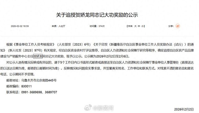 【#贺娇龙拟追记大功#】2月2日,新疆维吾尔自治区人社厅发布《关于追授贺娇龙同志记大功奖励的公示》。公示称,根据有关规定,经自治区农业农村厅评议推荐,自治区人力资源和社会保障厅研究等程序,确定追授自治区农产品品牌建设与产销服务中心主任贺娇龙同志记大功奖励,现予以公示。公示期为2026年2月2日至2月6日。贺娇龙,女,汉族,中共党员,1979年12月出生,四川射洪人,曾荣获全国三八红旗手、2022年度三农人物、新疆维吾尔自治区先进工作者等荣誉。