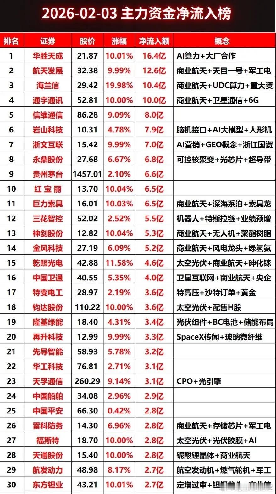 2月2日主力资金流入流出TOP30,快来看看谁在涨谁在跌!💰📈📉主力资