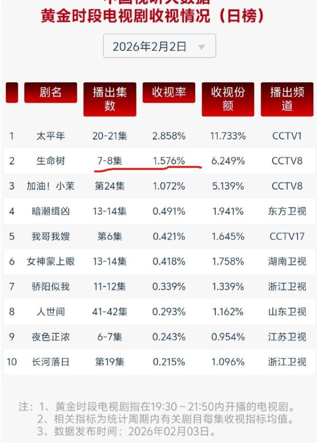 《生命树》热度破8500! 《生命树》的热度涨到8500了,但是收视率越来越低了,CVB收视率已经从开播的1.7%跌到1.5%了,以这个趋势,最终的CVB平均收视率可能到不了1.7%,杨紫确实有点不抗收视,近几年上星七八部剧,只有《余生请多指教》和《国色芳华》拿到了央五卫三的成绩,除了湖南卫视,其他电视台没有央五卫三实绩,而且她的剧只扛第一季,不扛第二季,只扛古偶和现偶,其他题材目前还没扛起任何一部剧。