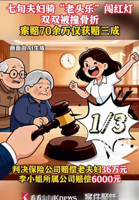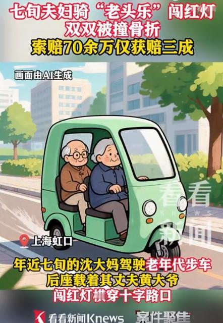 “谁弱谁有理?”2月2日,上海,70岁老夫妻驾驶三无“老头乐”闯红灯,与正常行驶的轿车相撞,车祸致两位老人多处骨折,事后他们向车主以及保险公司索赔70余万元,可法院判决却引发了争议。(文中人物均为化名) 事发当天上海虹口区一处十字路口,年近七旬的沈大妈驾驶着一辆无牌照、无保险、无合法上路资质的 “老头乐” 代步车,载着丈夫黄大爷径直闯过红灯。 此时,李小姐驾驶的白色轿车正依照绿灯信号正常通过路口,两车瞬间猛烈相撞。巨大的冲击力让沈大妈和黄大爷被甩出车外,两人当场倒地,经医院诊断均为多处骨折,沈大妈的右腿和黄大爷的肋骨伤势尤为严重,后续还需长期康复治疗。 沈大妈退休前是社区里出了名的 “急性子”,做事风风火火,认定的事情很少听劝。半年前,她看到邻居们都在用 “老头乐” 代步,觉得不用考驾照、不用上牌,出门买菜、去公园遛弯都方便,便花了八千块钱买了这辆车。 她从未系统学习过交通规则,日常开车全凭直觉,遇到红灯只要没车就直接闯,黄大爷性格温和,一直默许妻子的行为,觉得 “年纪大了,没人会较真”。 事发当天,两人正是急着去菜市场抢新鲜的蔬菜,才在红灯亮起时加速横穿路口。 事故发生后,沈大妈和黄大爷被送往附近医院救治,前期住院费、手术费就花了 18 万元,后续康复和护理费用还在持续增加。 两人的子女认为,轿车驾驶员李小姐应当承担全部责任,于是联合向李小姐及其所属公司、车辆投保的保险公司提出总计 72 万元的索赔,包括医疗费、营养费、护理费以及精神损害抚慰金等。 李小姐是一家互联网公司的行政专员,事发时正驾车去公司取文件,她严格按照绿灯信号通行,行车记录仪完整记录了整个过程。 交警部门经过现场勘查和调取监控,最终认定沈大妈驾驶三无车辆闯红灯,负事故主要责任,需承担 70% 的责任;李小姐虽正常行驶,但因未完全尽到观察义务,负次要责任,承担 30% 的责任。 虹口区人民法院随后对此案作出判决:保险公司在交强险和商业险范围内赔偿沈大妈夫妇 36 万元,李小姐所属公司额外赔偿 6000 元,总赔偿金额仅占索赔金额的三成。 这一结果公布后,迅速在网络上引发热议。 有网友在评论区留言:“闯红灯本身就是违法,年纪大不是免责的理由,这个判决算是给所有心存侥幸的人提了醒。” 也有网友表示:“老头乐的问题早就该管管了,无牌无证上路,不仅害自己,还害别人。” 还有网友替李小姐鸣不平:“正常开车还要赔钱,虽然比例不高,但还是觉得有点冤,希望以后能出台更明确的规则。” 这件事给所有人都敲响了警钟:交通规则是保障出行安全的底线,无论年龄大小、驾驶何种车辆,都必须严格遵守。老年人在选择代步工具时,不能只图方便而忽视合法性,“老头乐” 无牌无证上路,不仅自身安全无法保障,还会给其他交通参与者带来风险。 同时,其他驾驶员在路口行驶时,也需保持高度警惕,留意周围可能出现的突发状况,避免意外发生。此外,相关部门也应加强对 “老头乐” 这类低速代步车的管理,从源头上减少安全隐患。 你怎么看待这起事故的判决结果?对于 “老头乐” 的管理,你有什么建议?欢迎在评论区留下你的看法。