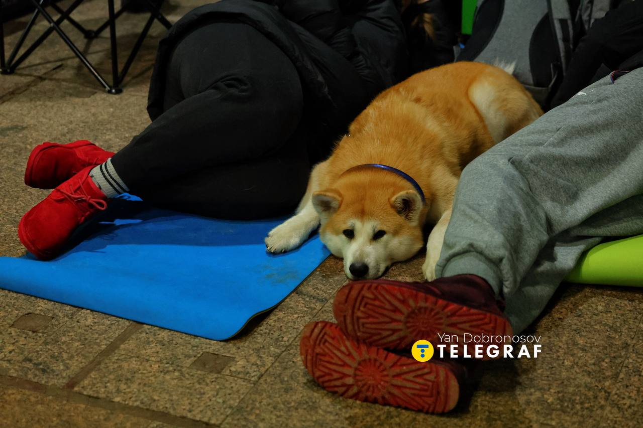 昨晚,基辅市民在地铁站避难,还有狗狗