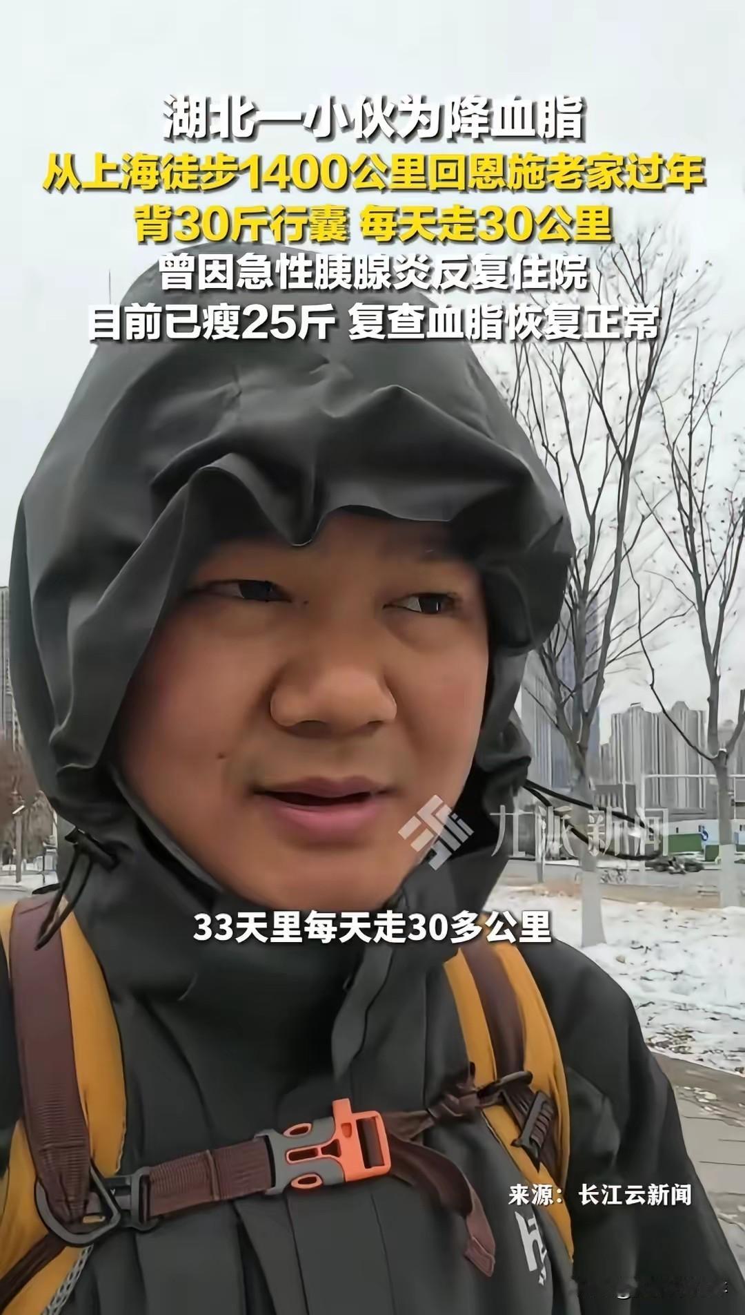 “这是一场自我救赎”!湖北,小伙子因为胰腺炎反复住院,血脂高出正常值10多倍,吃药无果后,他做了一个大胆决定! 2026年1月1日从上海出发,徒步1400公里回老家过年,把归途变成康复之旅。 查询路线,做好攻略,他计划40天内完成。背上近30斤行囊出发! 这个小伙子叫小杨,今年29岁,在上海做互联网运营。前两年熬夜加班、顿顿外卖,体重飙到180斤,去年冬天因为急性胰腺炎住了三次院,医生说他血脂高到“随时可能引发心梗”,开的药吃了大半年,指标还是没降下来。 小杨说,躺在病床上的时候,看着窗外的树影晃来晃去,突然就怕了。他不想后半辈子都靠吃药维持,更不想让远在恩施的父母担心。2026年元旦那天,他背着帐篷、睡袋和换洗衣物,从上海张江的出租屋出发,沿着国道往老家走。 每天早上六点起床,煮一碗泡面当早餐,然后背着30斤的行囊开始赶路。一开始走10公里就腿软,他就把路程拆成一段段,每走5公里就停下来拉伸。遇到下雪天,路面结冰,他就套上冰爪慢慢挪。晚上就在服务区或者乡镇的小旅馆落脚,睡前还要做一组平板支撑。 走到第20天的时候,他在安徽境内遇到了一场暴雪,浑身冻得发麻,差点想放弃。就在他蹲在路边搓手的时候,路过的货车司机递给他一杯热姜茶,说“小伙子,坚持住,恩施不远了”。这句话让他咬着牙又走了下去。 出发时的180斤,到第33天已经降到155斤。他在武汉的医院复查,血脂直接降到了正常范围,医生都不敢相信,说“这比任何药都管用”。现在他每天还在走,预计腊月二十九就能到家,刚好赶上吃年夜饭。 视频发到网上后,评论区全是佩服的声音。有人说“这才是真正的新年礼物,把健康带回了家”,也有人质疑“这么走会不会伤膝盖”,还有人说“我也血脂高,明天就开始跑步”。 我想起去年陪我爸去体检,他也是血脂高,医生让他运动,他总说“年纪大了跑不动”。小杨的经历告诉我,不是做不到,是没逼自己一把。很多人把“忙”“累”当借口,却忘了健康是1,其他都是0。 小杨说,这次徒步不是为了证明什么,是想告诉和他一样的年轻人,别等身体垮了才想起珍惜。他已经计划到家后,带着父母一起每天散步,把健康的习惯留在家里。 如果是你,会为了健康辞掉工作、花40天徒步回家吗?你觉得年轻人该如何平衡工作和健康?欢迎在评论区讨论。