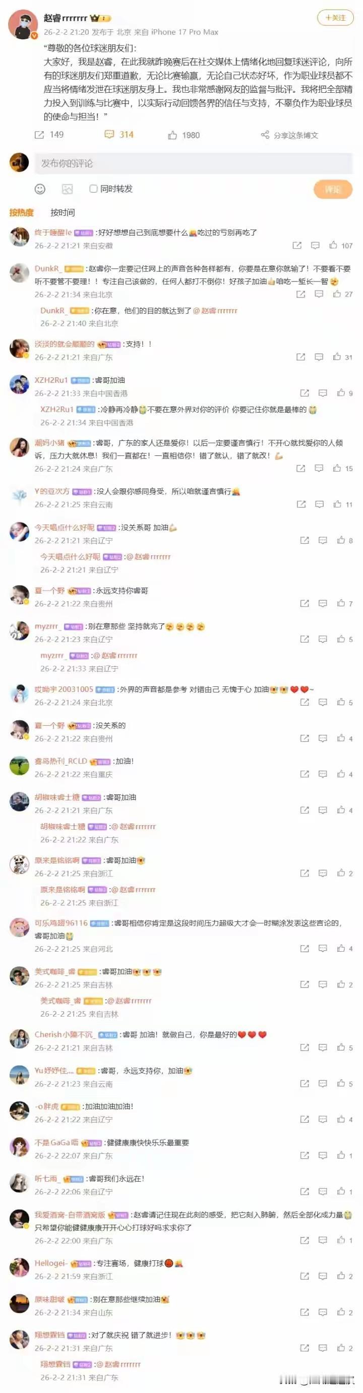 CBA球星点评2月1日首钢惜败青岛赛后,赵睿因关键罚球失手情绪失控,在社交平台用“回去打馕吧”“新疆人民没主观思想”等言论回怼新疆球迷,涉嫌地域歧视引发轩然大波。2月2日他发布致歉声明,承认不该向球迷发泄情绪,却避谈争议关键词,被指诚意不足。作为国手级球员,赛场抗压与言行边界都是必修课,唯有正视错误、精准致歉,才能重建信任,用球技而非争议立足CBA。