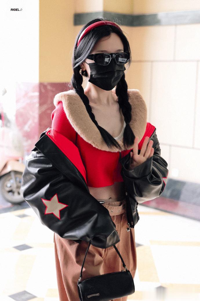 红色发箍+红色的马甲+外套红色内衬+露脐,又艳又辣红红火火的,还是双马尾,石榴红,喜庆呀
