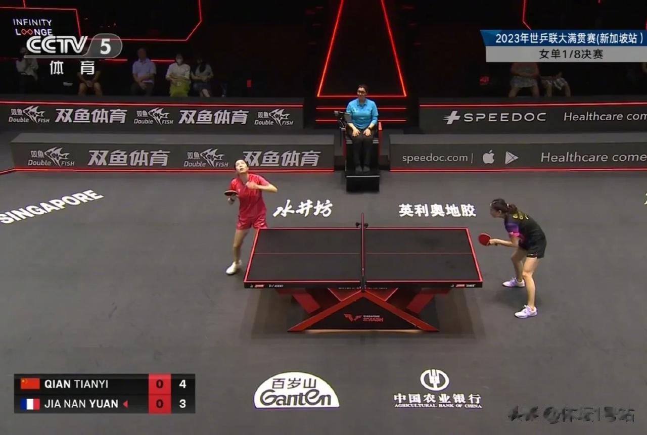 快讯:国乒头号女神钱天一,3:2战胜高抛球世界纪录女王袁嘉楠 WTT新加坡大满贯2023,女单1/8决赛 钱天一3-2袁嘉楠【9-11,9-11,11-5,11-2,11-6】 钱天一就此晋级女单八强。这是一场艰苦的比赛。袁嘉楠的高抛发球,给钱天一造成了很大的压力,钱天一在先失两局的情况下,通过旋转变化,连扳三局。 袁嘉楠曾经在与孙颖莎的比赛中抛出国5.4米的高抛球,这也是世界高抛球最高纪录,当时莎莎也是大吃一惊。