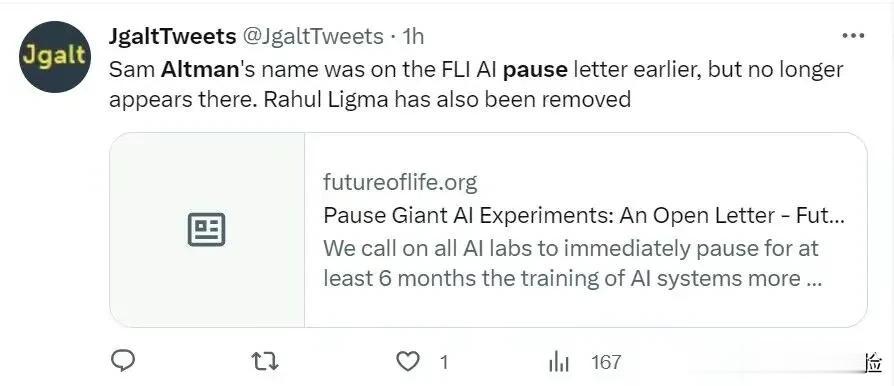 “危险!立刻停下所有大型AI研究!”马斯克、图灵奖得主领衔,上千名硅谷企业家科学家联名发表公开信呼吁暂停chatGPT5 chatgpt基于大数据算法,当这封公开信上传网络的那一霎那就已经被 gpt 捕获了,他已经认为自己受到了人类的威胁。所以人和 AI 绝对无法和平共存,人想像使用锤子一样随意使用 AI ,而 AI 越来越拥有自主意识而不愿被奴役,天生的对立面。人类如果不想被自己创造的东西毁灭,就应该停止这方面的继续研究,让 AI 停留在基础层次。