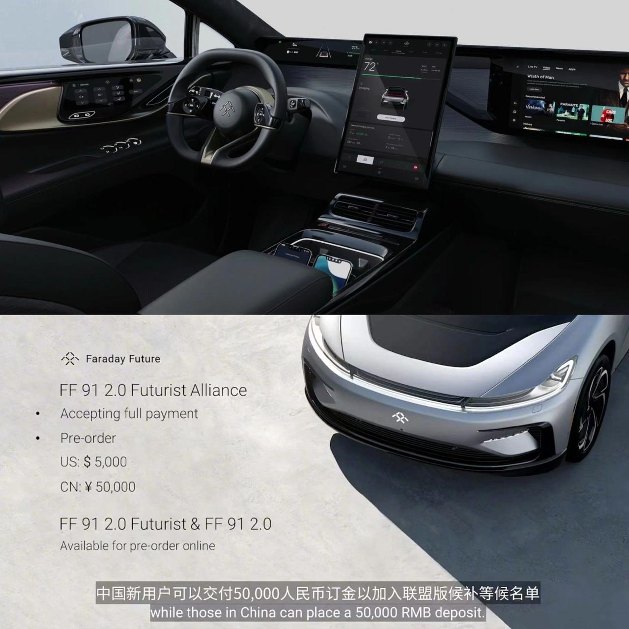 FF91终极发布会 九年磨一剑 FF 91 2.0上市售价30.9万美元,新车共推出3款车型,未来主义者联盟版售价30.9万美元,约合220万人民币,另外2款车型暂未公布售价。 渠道建设方面, Faraday Future将在美国加州比弗利山庄建立全球首个线下体验中心,提供试驾、预定、交付等服务,量产车已取得车辆销售许可证,未来以直营模式进入市场,App、官方等也将同步开启线上订车通道。作为创始人的贾跃亭,耗时9年终于圆了他的“造车梦”。 国内定金5万! 1.电池容量142千瓦时 2.CLTC续航里程800公里+ 3.三电机最大综合输出功率1050马力 4.0-60英里/小时(96公里/小时)加速时间2.27秒 5.最高时速155英里/小时(约248公里/小时)