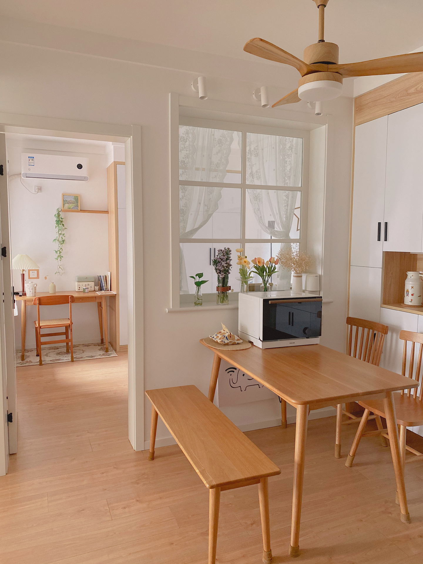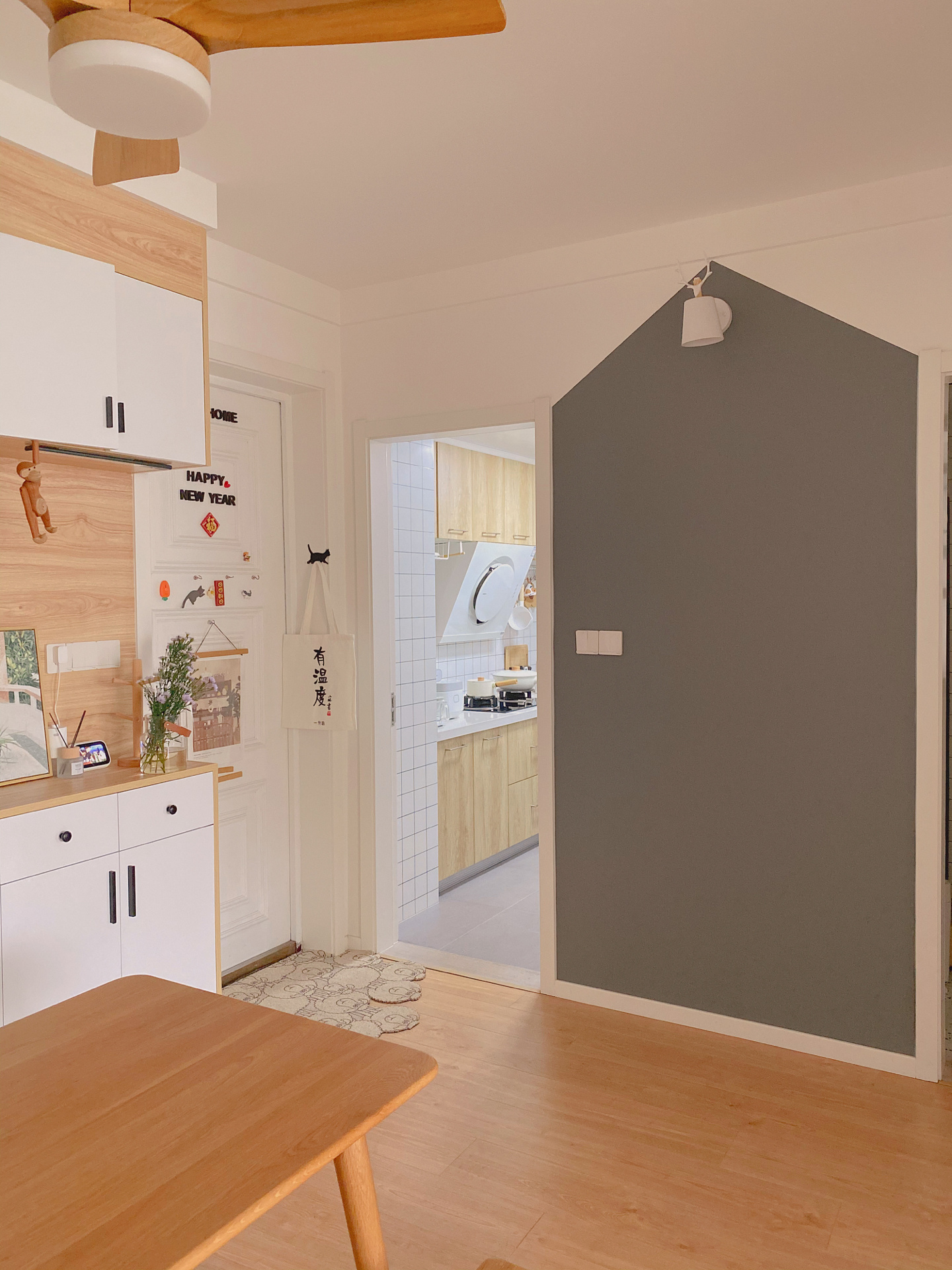 我家基本上就是三个颜色:白色和原木色为主色调,绿色和黑色为辅