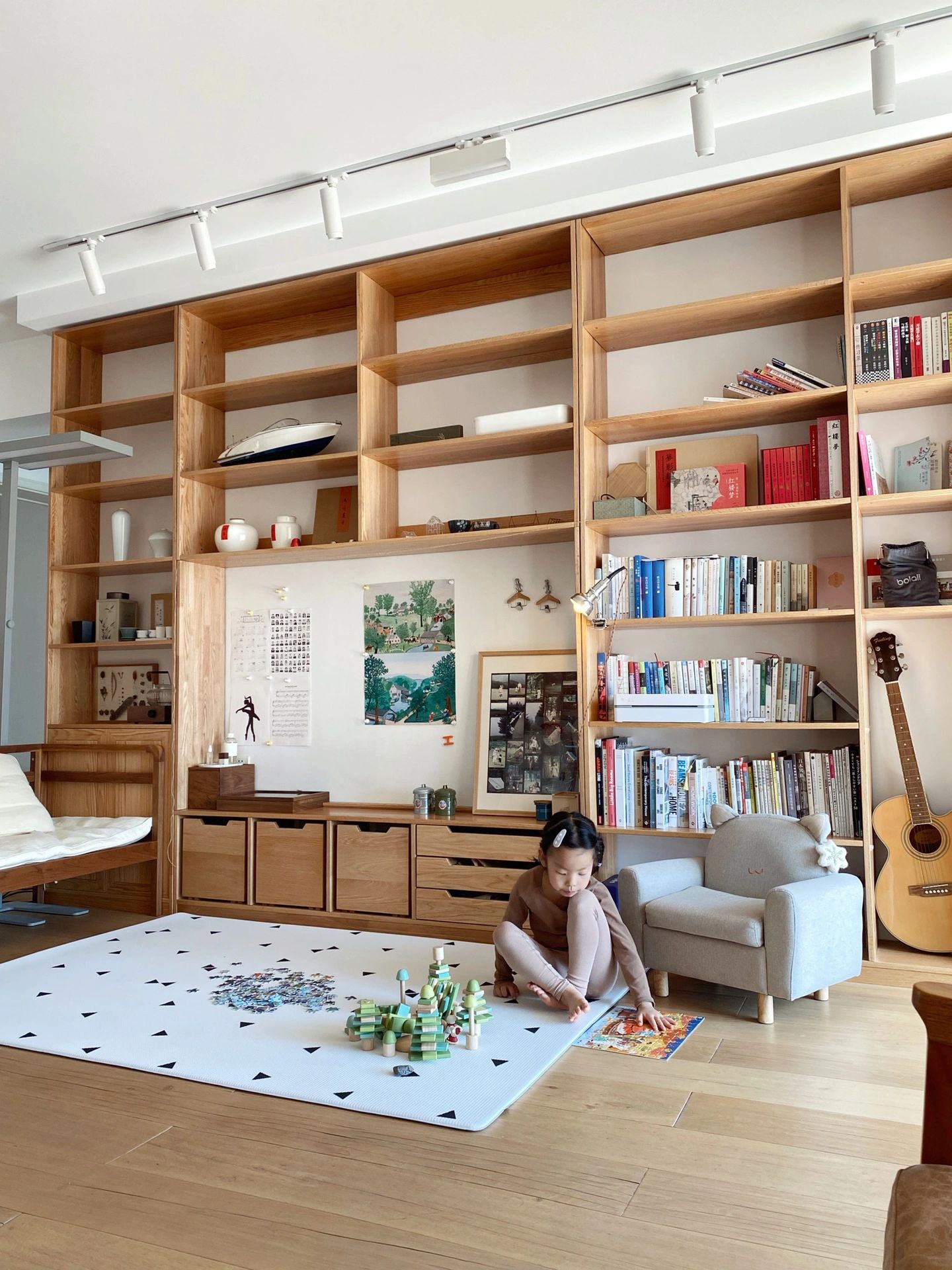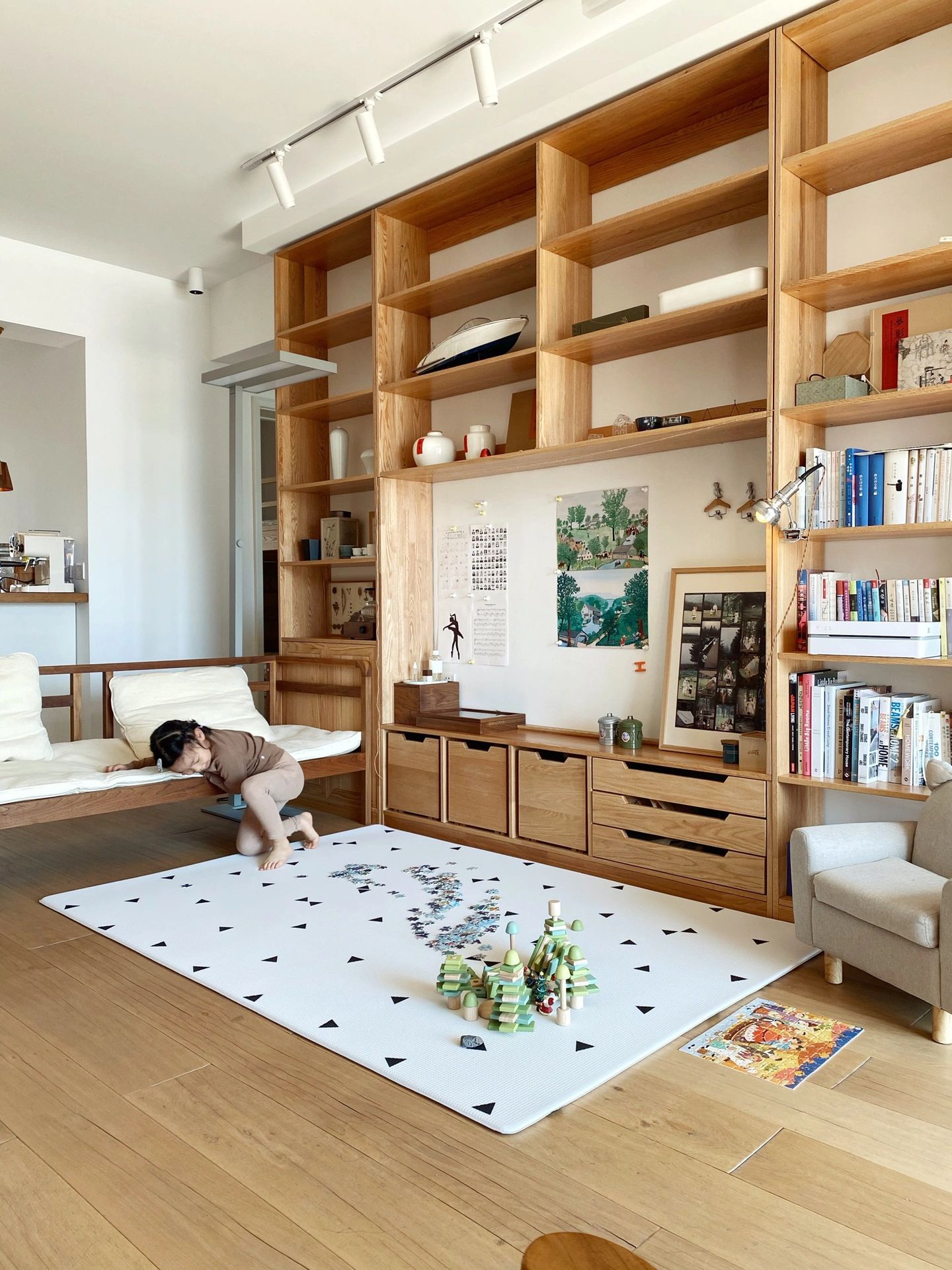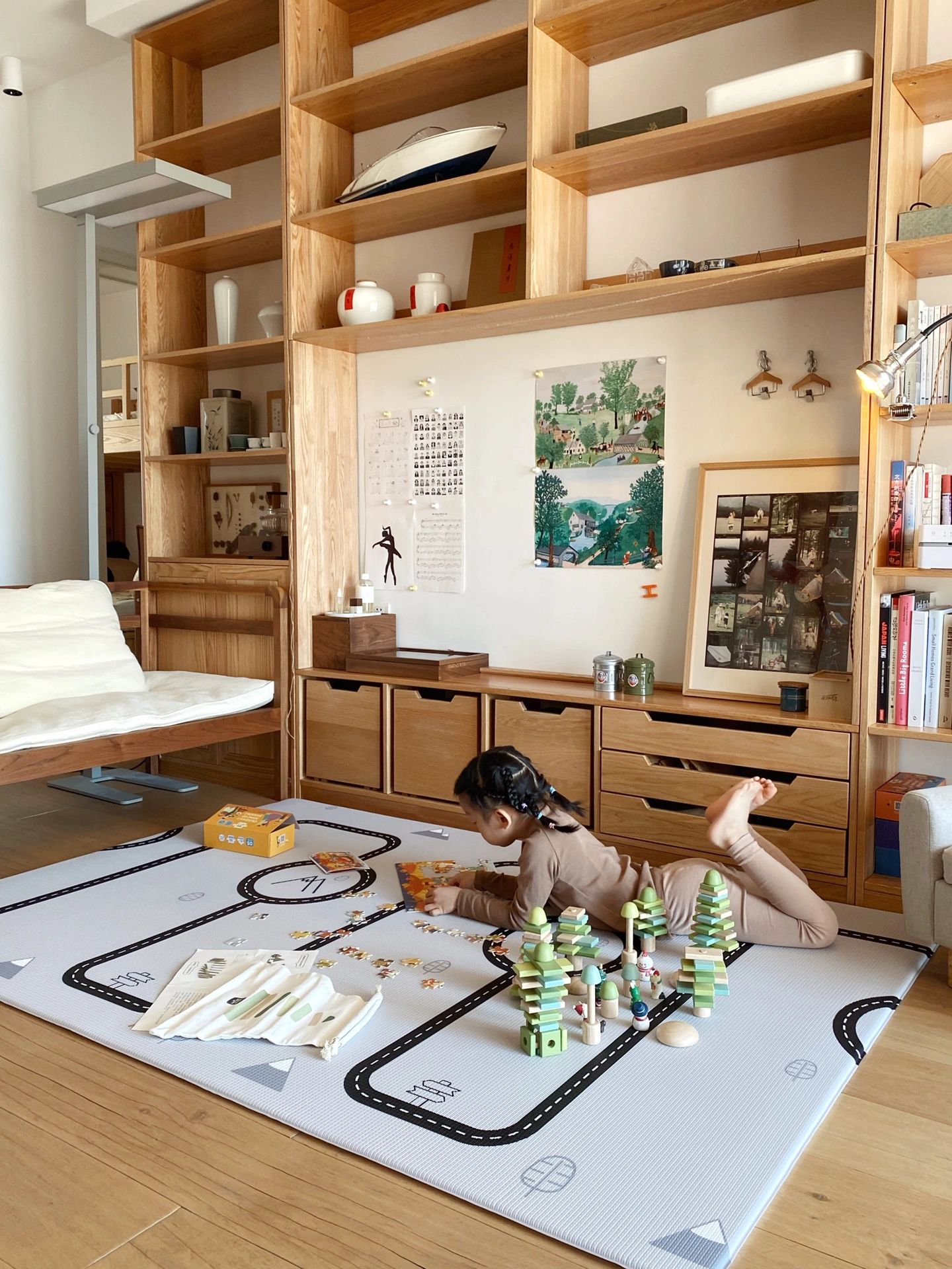 💎铺上爬爬垫,给宝宝一片属于自己的小天地,平时一起在上面拼图、摆积木、翻百科全书、大开绘本等等,晚上还可以躺在地上,在书架对面的墙上放投影,来了客人还能做临时地铺