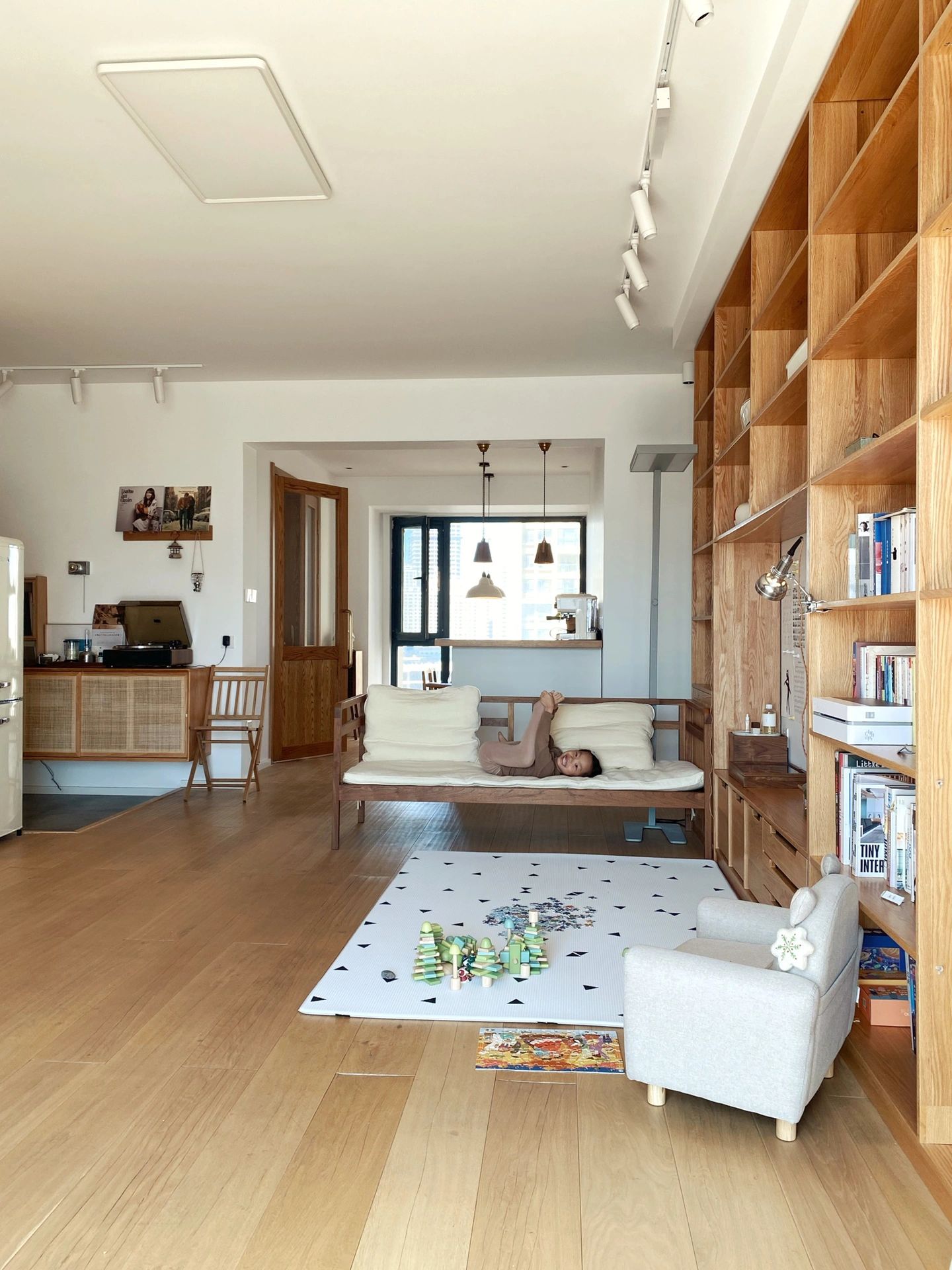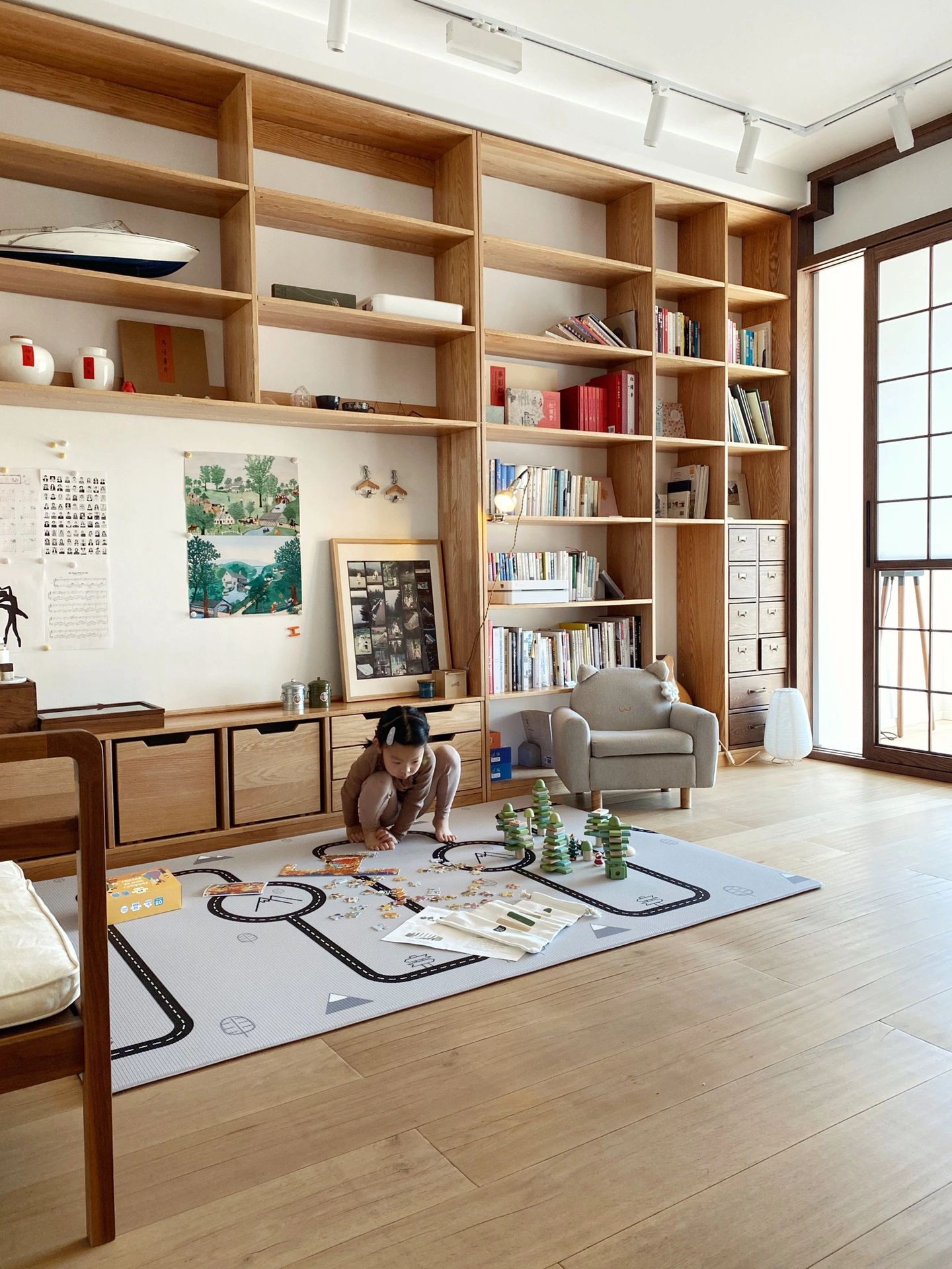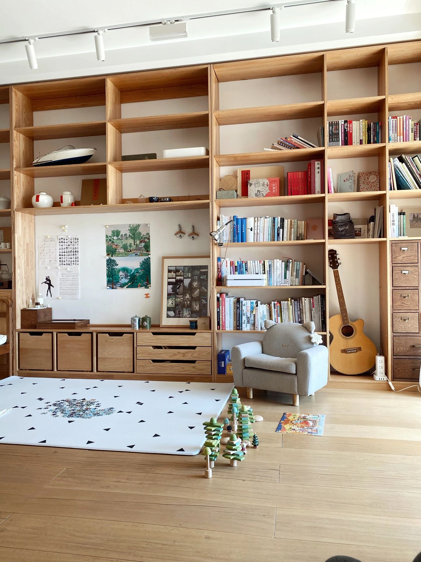 💎铺上爬爬垫,给宝宝一片属于自己的小天地,平时一起在上面拼图、摆积木、翻百科全书、大开绘本等等,晚上还可以躺在地上,在书架对面的墙上放投影,来了客人还能做临时地铺