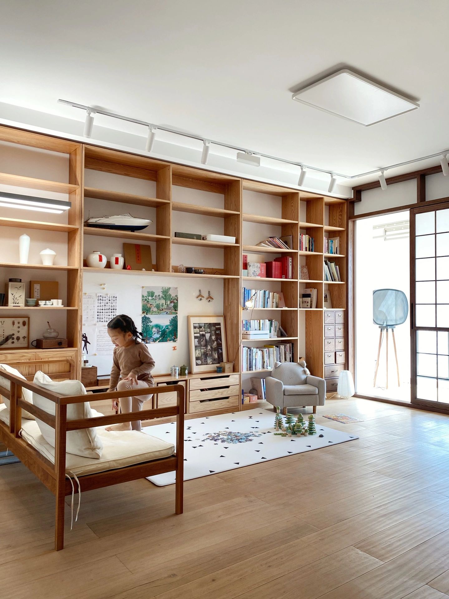 💎沙发垂直于书架放置,书就在触手可及的地方,随手拿来一本很方便,营造出亲子阅读和围坐的氛围感
