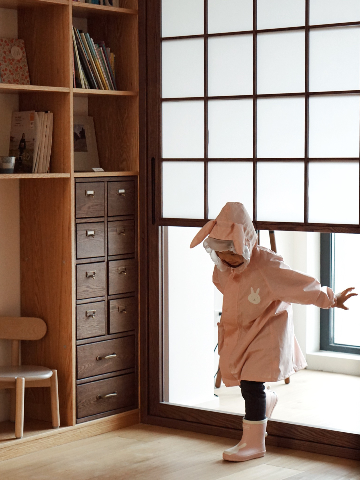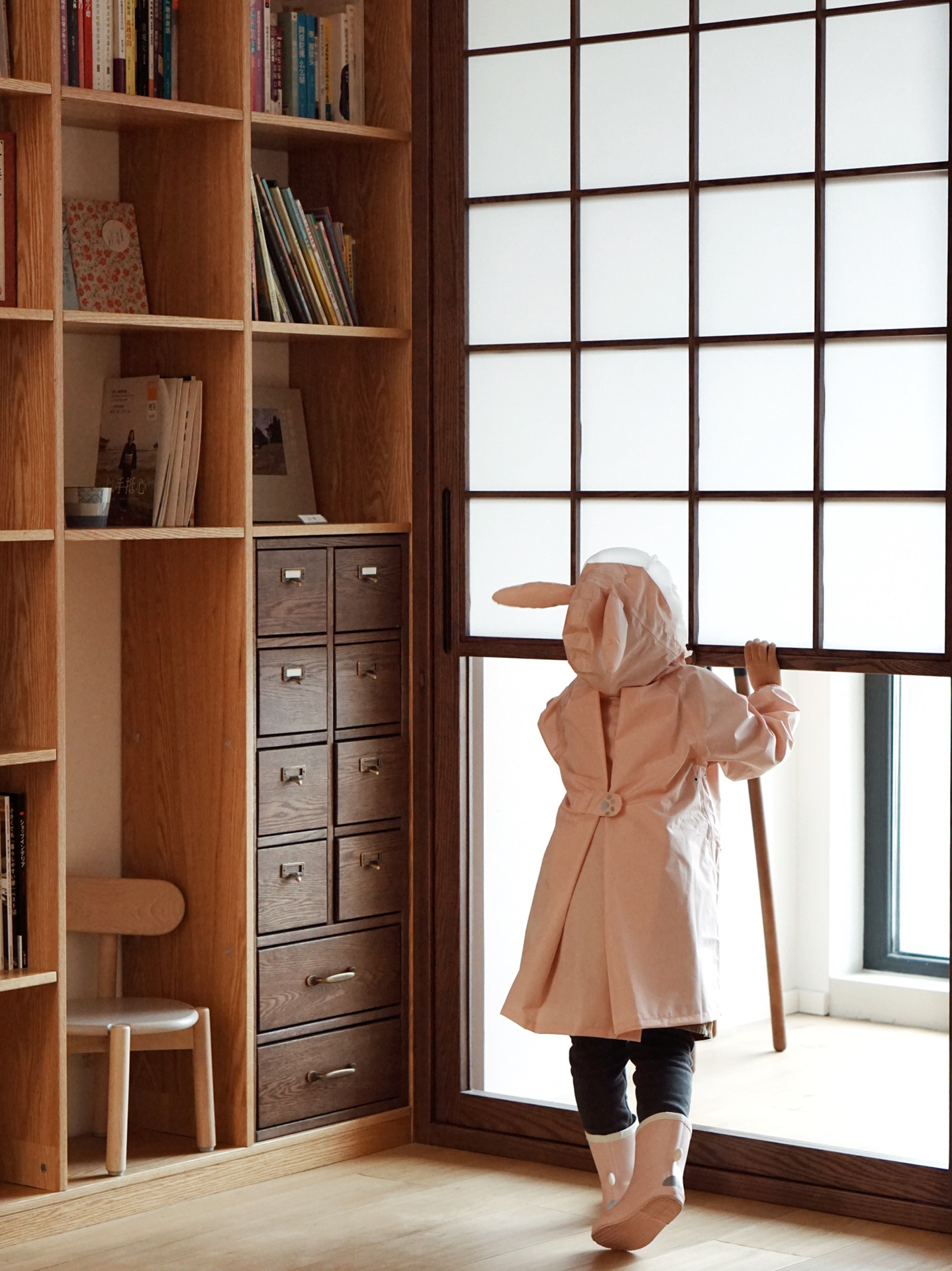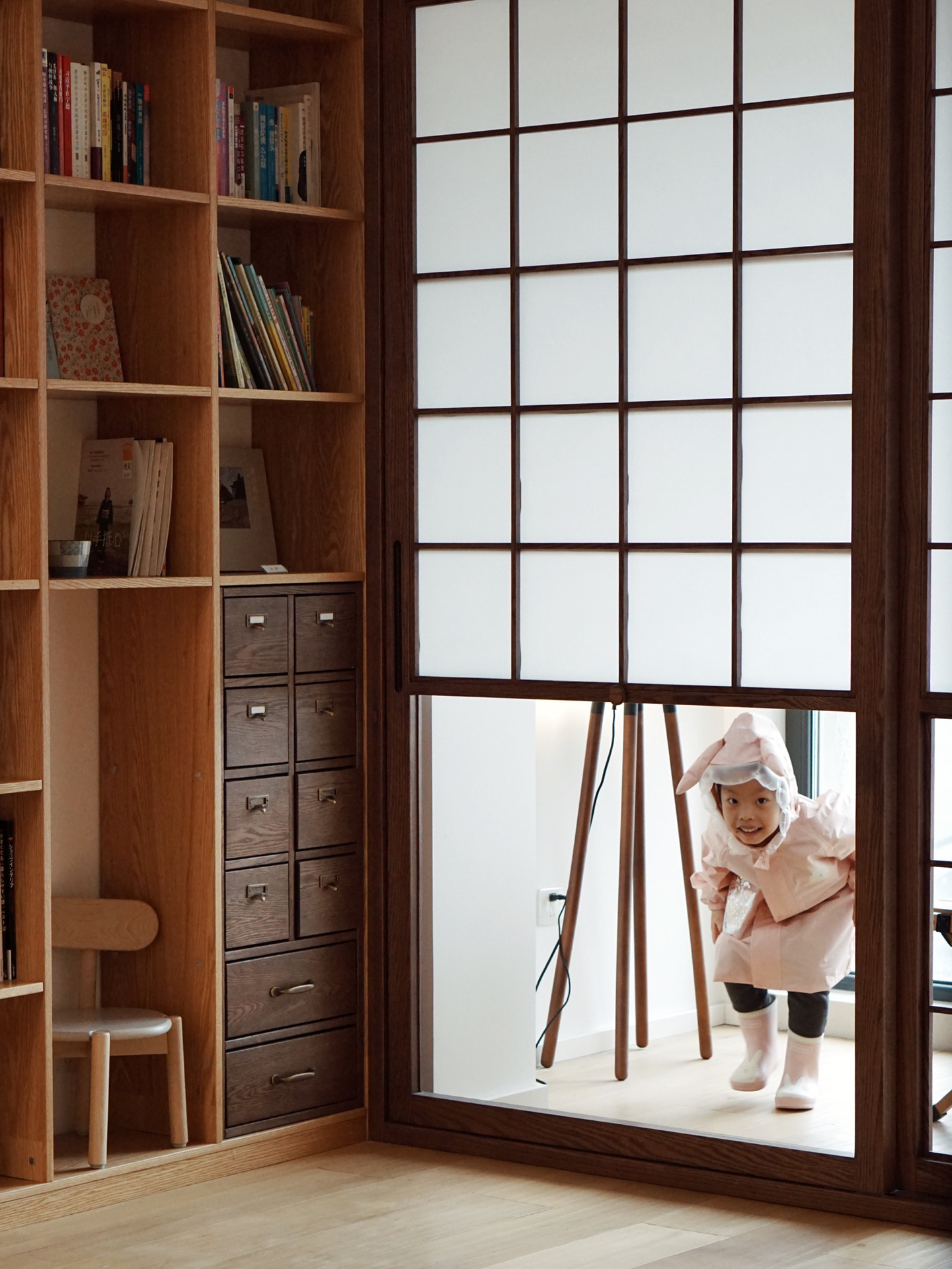 参考「龙猫」和「海街日记」做了两扇障子移门,移门下面的部分可以推到上面去,这样娃就可以在下面钻来钻去