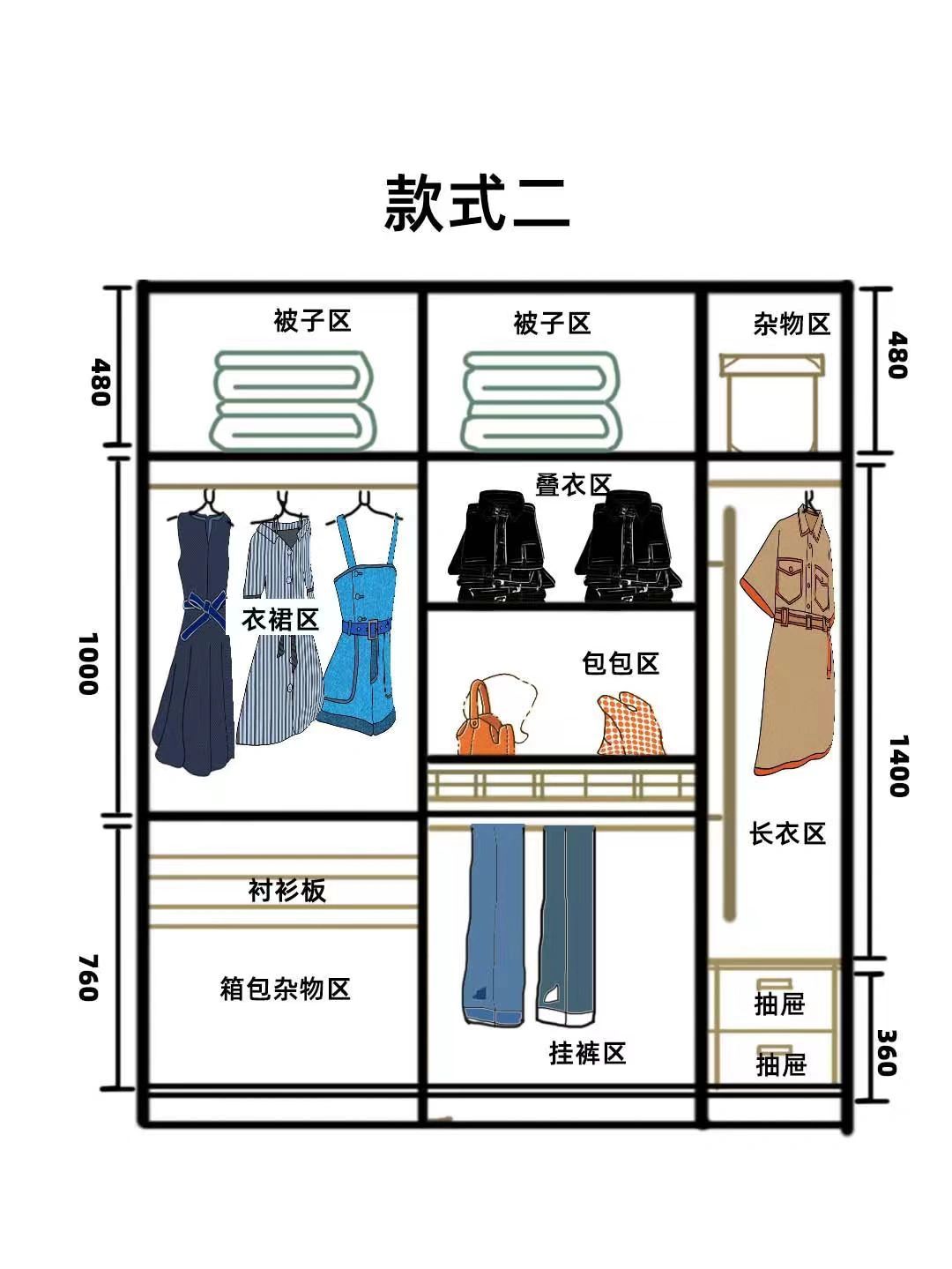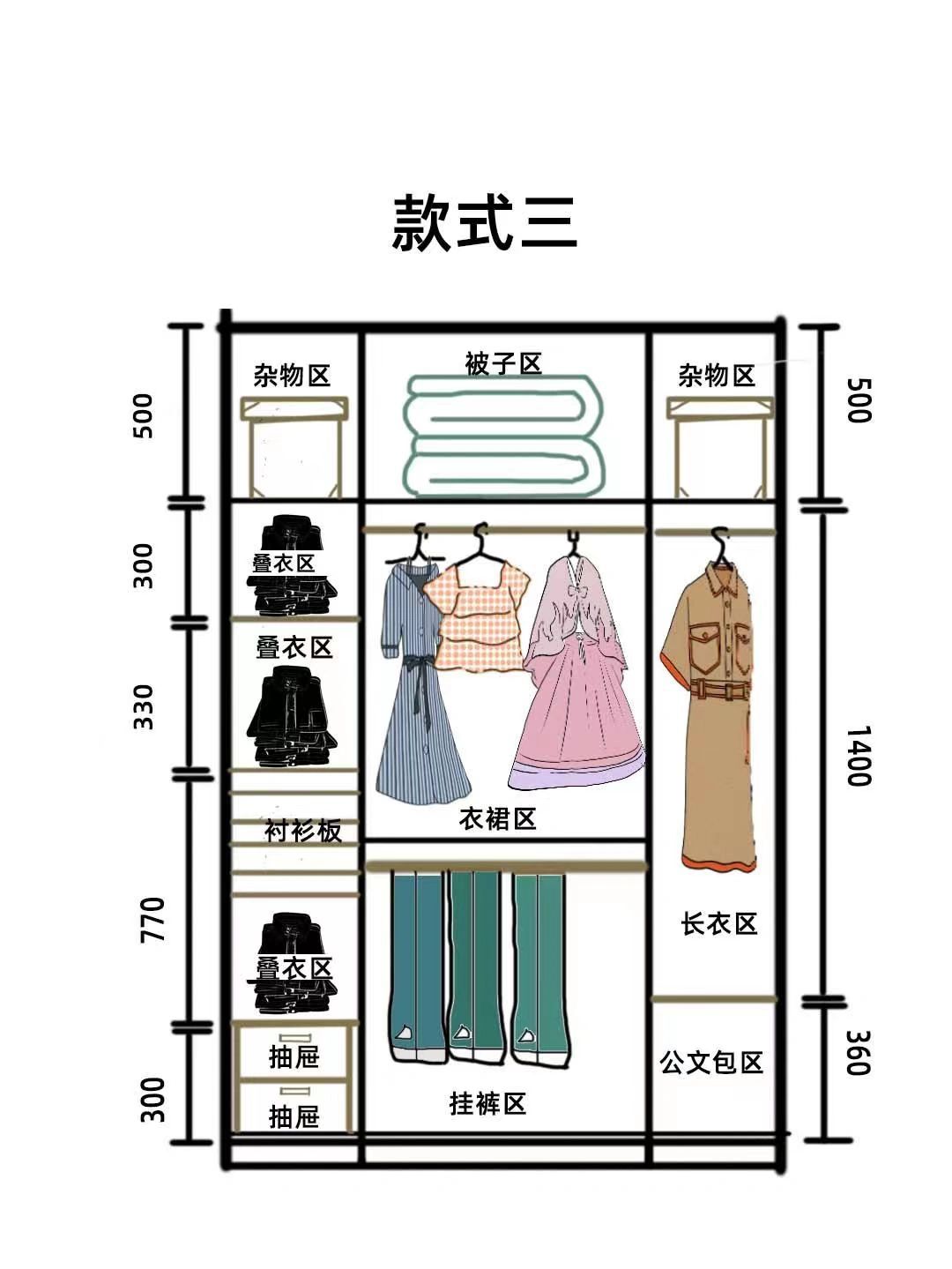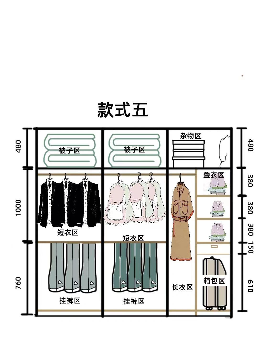 ✅分区要多:长衣区、挂裤区、叠衣区、衣裙区、被子区、杂物区、抽屉、这七个区要融合进衣柜设计当中。