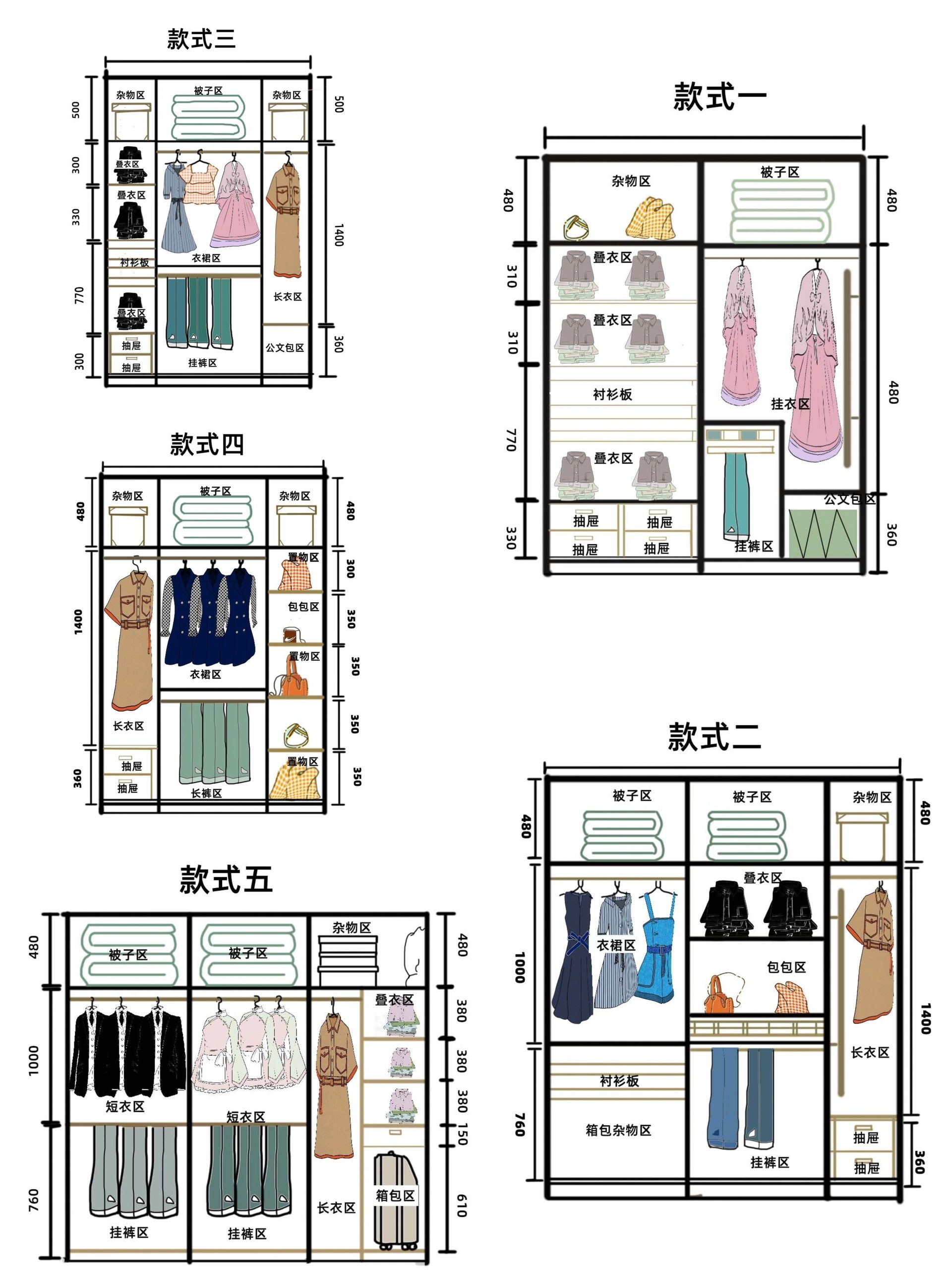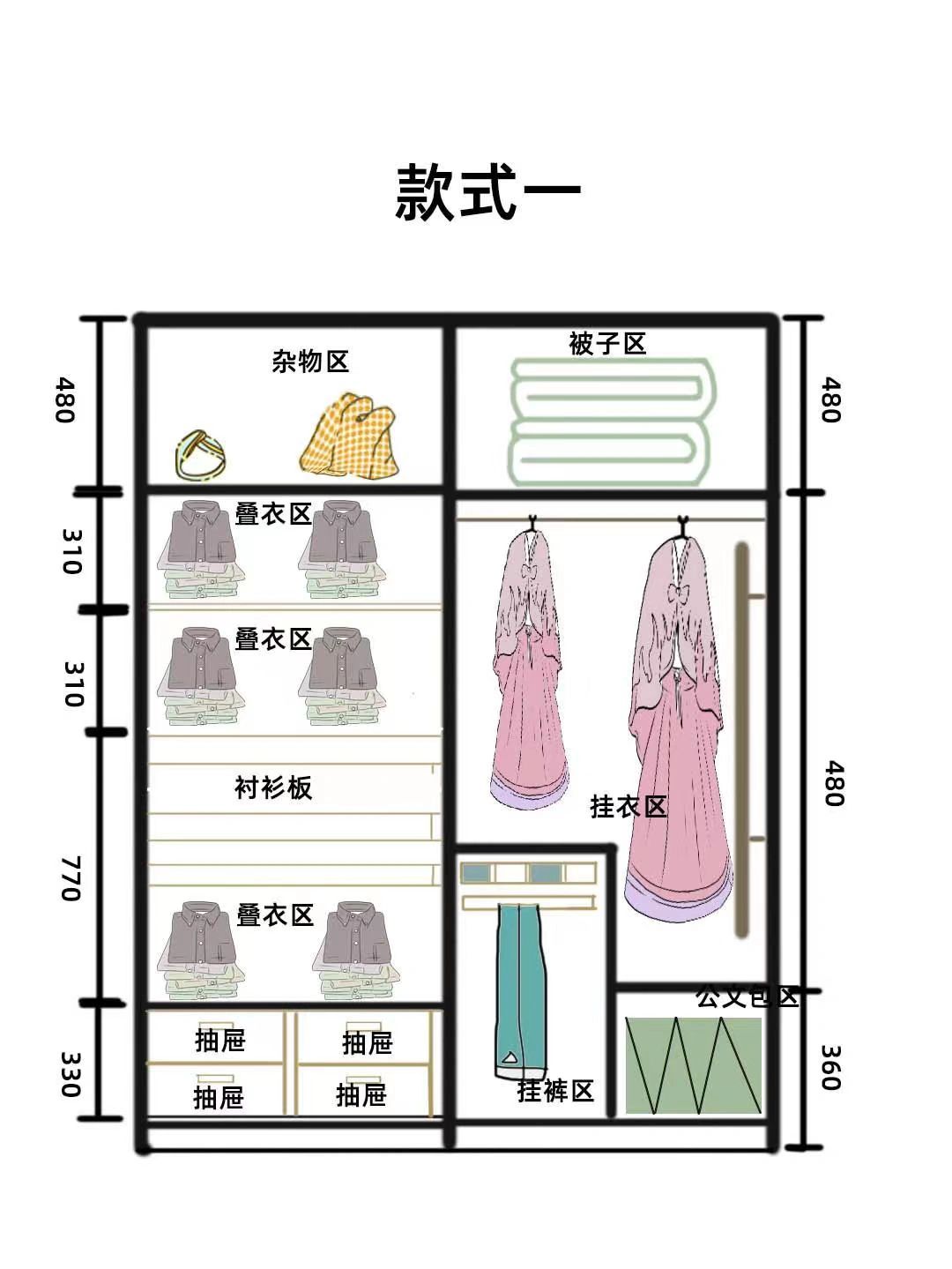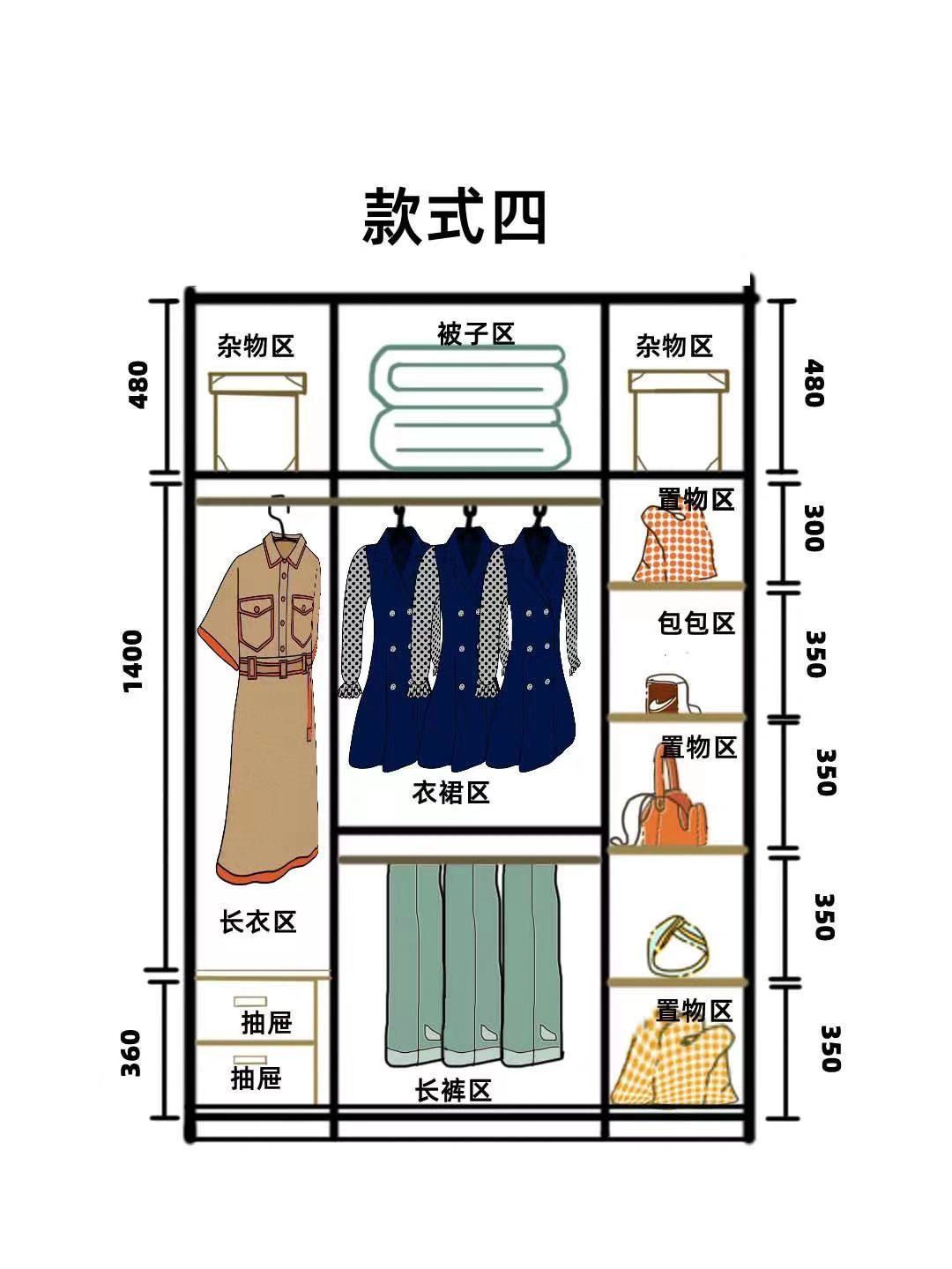 ✅分区要多:长衣区、挂裤区、叠衣区、衣裙区、被子区、杂物区、抽屉、这七个区要融合进衣柜设计当中。