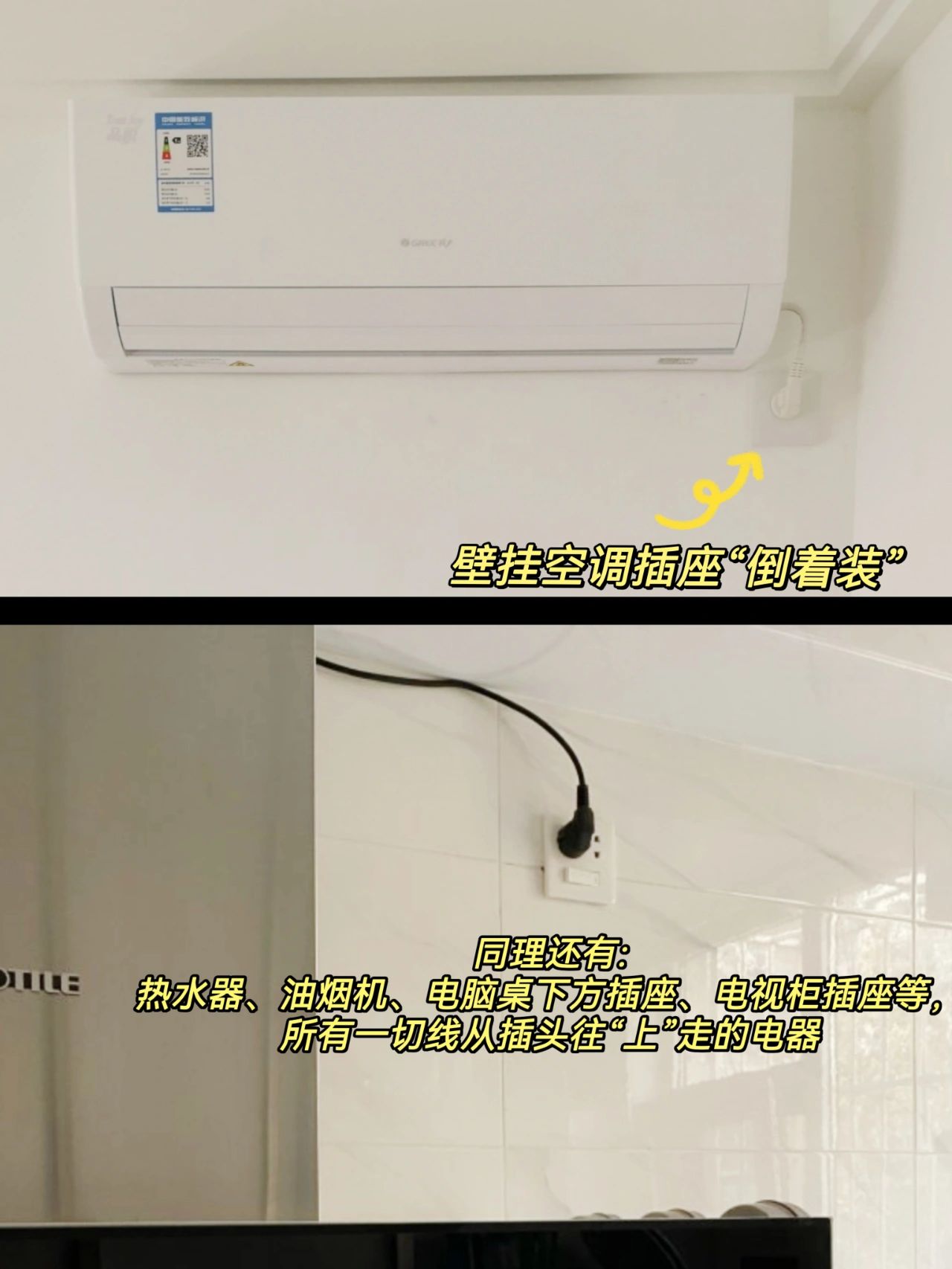 ⑨这些插座要倒装:热水器、油烟机、壁挂空调、电脑桌下方、电视柜下方