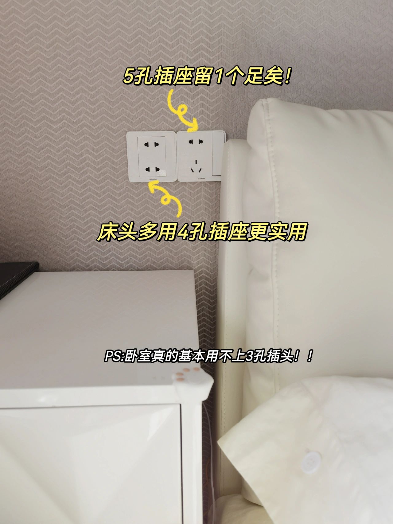 ①卧室尽量多预留4孔🔌插座,床头床尾各预留1个5孔插座足矣,因为在卧室你基本用不上3孔插头⚠️