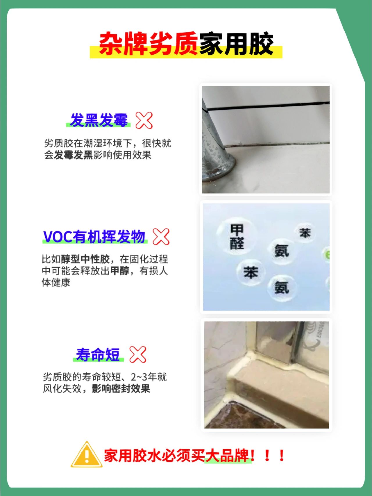 如果你嫌麻烦用了师傅自带的免费杂牌胶(一般都是几块钱一管的三无产品),恭喜你已经完美踩坑🕳️时间长了不仅必然会发霉发黑影响使用效果,最可怕的是杂牌玻璃胶还含有甲醛、VOC等有害挥发物🥲,严重影响家人身体健康,绝对儿戏不得⚠️❌