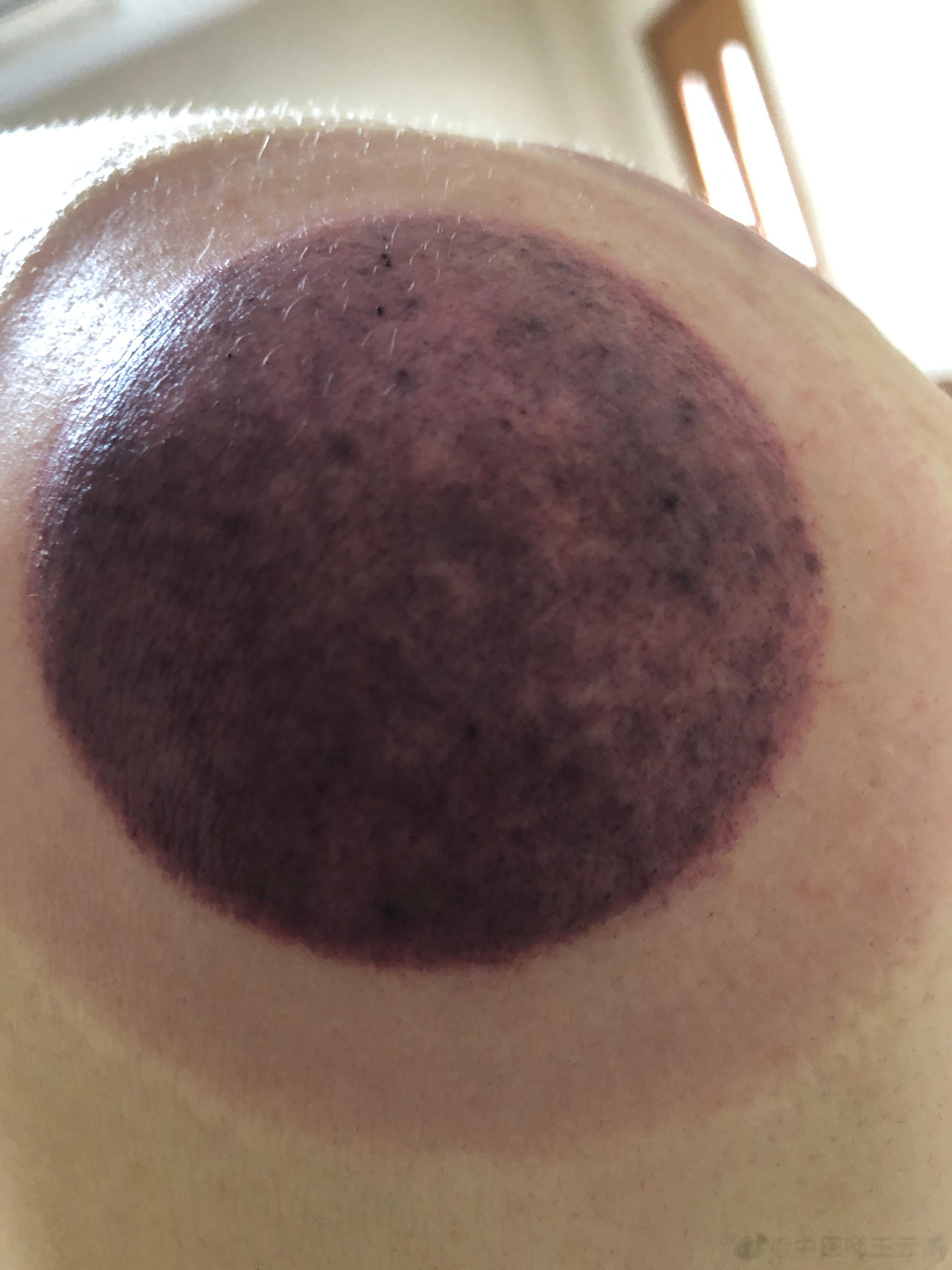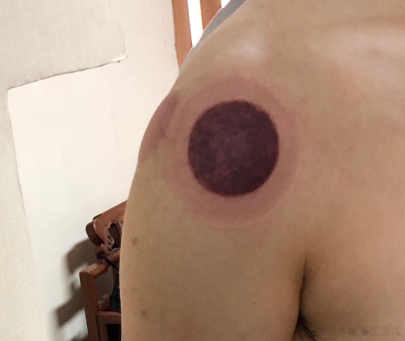 几年前被空调冷风吹的左肩关节疼痛,甚至无法举起左手臂。当时自己拔火罐后,疼痛消失。有几年没有疼痛过了。近期又被空调直吹左肩,昨晚九点多地铁冷风再次直吹左肩,今晨突然左肩关节疼痛加剧。于是,自己拔了火罐,局部皮肤颜色相当很有特点。
