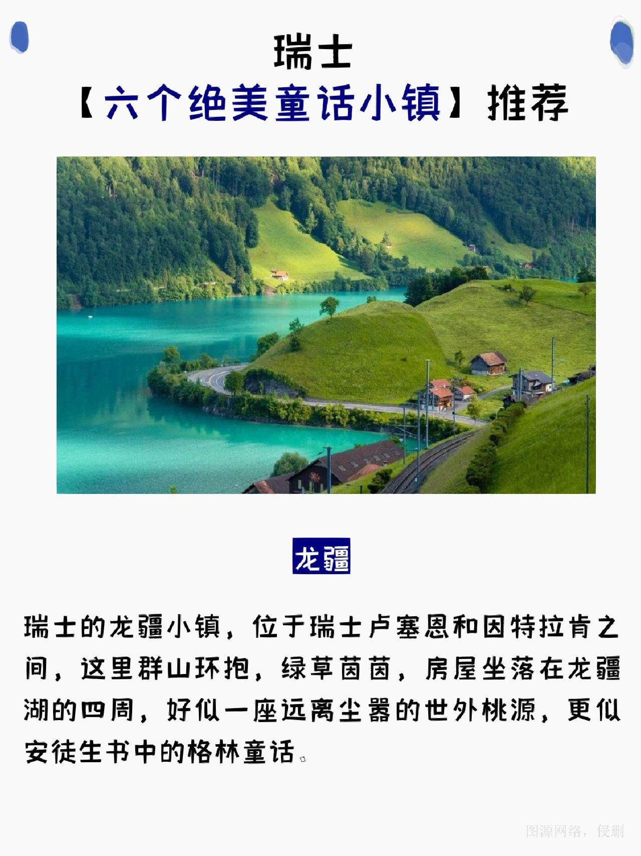 瑞士的龙疆小镇,这里群山环抱,绿草茵茵,房屋坐落在龙疆湖的四周,好似一座远离尘嚣的世外桃源,更似安徒生书中的格林童话。