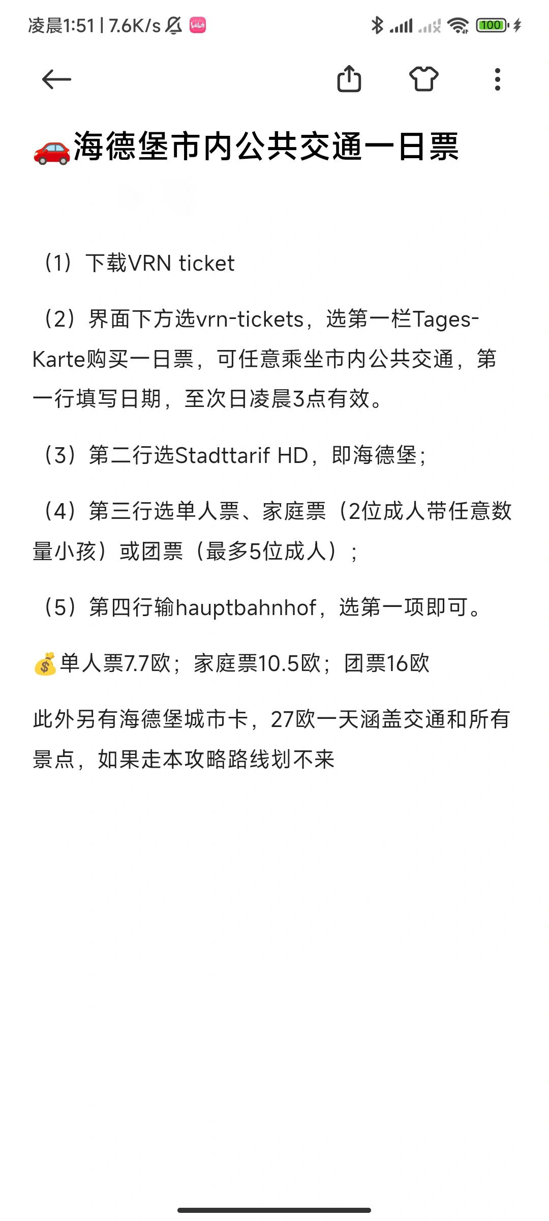 海德堡→斯图加特共三天两晚。本篇介绍海德堡半日游的路线和市内交通。 p1-p2 内卡河老桥 p3 城堡打卡点 p4 市内交通攻略 路线 :火车站→谷物市场→城堡→老城(学生监狱、圣灵大教堂、市集广场)→内卡河畔(老桥、俾斯麦广场、哲学家小径) 火车站:可付费寄存大件行李,但储物柜现在在修,可以问问前台寄存。 谷物市场 kornmarkt:吃完饭从这里上山。 🚠城堡门票本身就含缆车,不坐白不坐。搜索站点 Heidelberger Bergbahnen ,现场机器买票。到城堡只需坐到半山腰(lower funicular),来回成人票9欧。 也可以买上山顶的票,要14欧(很一般,不推荐) ⭐️城堡大约逛2个小时(花园50分钟,城堡外部30分钟,内部40分钟) 海德堡城堡 heidelberg schloss:可花5欧租一个讲解器,它会介绍打卡点。 城堡外部是一个大花园,值得好好逛逛,打卡点有一夜门、歌德椅等。 凭票进入城堡,可以看到一个哥特式、巴洛克式风格混合的建筑,打卡点是骑士跳和女巫咬等。 城堡内有几个很大的酒桶,是打卡点。另有一个药学博物馆免费参观,就是介绍药学发展史。 ⭐️下山逛老城 Altstadt,大约需要50分钟 学生监狱 Studentenkarzer:进门左转商店买票。 如果现场买票一般只能买到30-60分钟后的时间段,可以在等待途中逛逛周边,不然就提前几天电话预约。 ☎️ +49 6221 541 2815 💰成人票6欧,出示学生证明4.5欧 ❗️以前犯了校规的海德堡大学学生要在这里关禁闭,所以称为学生监狱。 墙上的涂鸦是学生们的吐槽,大多用德语书写,看不懂德语的朋友,就只能单纯来打卡了。 圣灵大教堂 heiliggeistkirche:新教(基督教)教堂,免费参观,可以花2欧登顶 市集广场 Marktplatz:老城区中心广场 ⭐️最后是很美的内卡河畔,大家好好逛逛,找找拍照角度,大约需要1个小时 老桥:超级出片! 俾斯麦广场:有一座铁血宰相俾斯麦(德意志帝国的主要缔造者)的雕像。 哲学家小径 Philosophenweg 1:这个地址是入口,向上走可以看到海德堡大学物理系。 但这条小径更像是一个健身步道,只有打卡意义,大家稍微走走拍拍照就好啦。