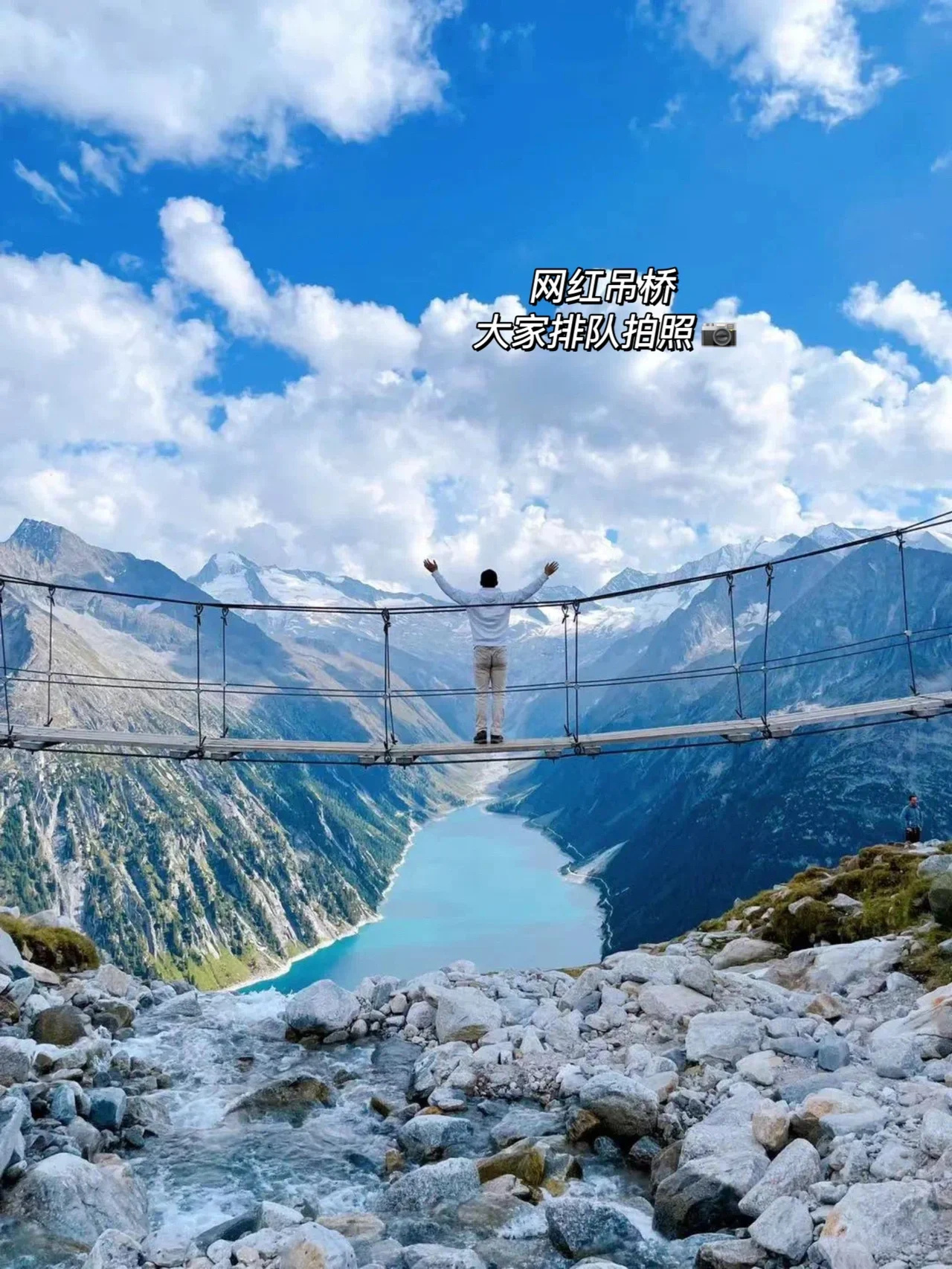 山顶处有个小吊桥,大家在那边排队打卡拍照,各种各样的拍照姿势,去之前以为是个很长的吊桥,还在思考这要如何拍照,去了之后才发现真的蛮小,上桥后再让拍照的人去前面找个好的角度拍照,就仿佛该吊桥很长。这吊桥也被称为奥地利网红吊桥,非常容易出片。