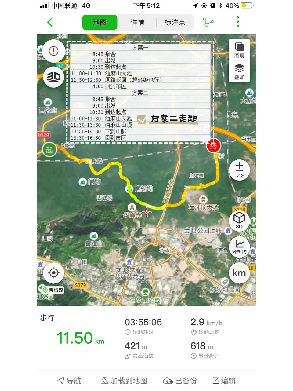 去之前做了很多攻略~金坑-油麻山-华峰山-石牙顶-麦村线大概12Km,耗时5-6H,走得快的3-4H就够了。