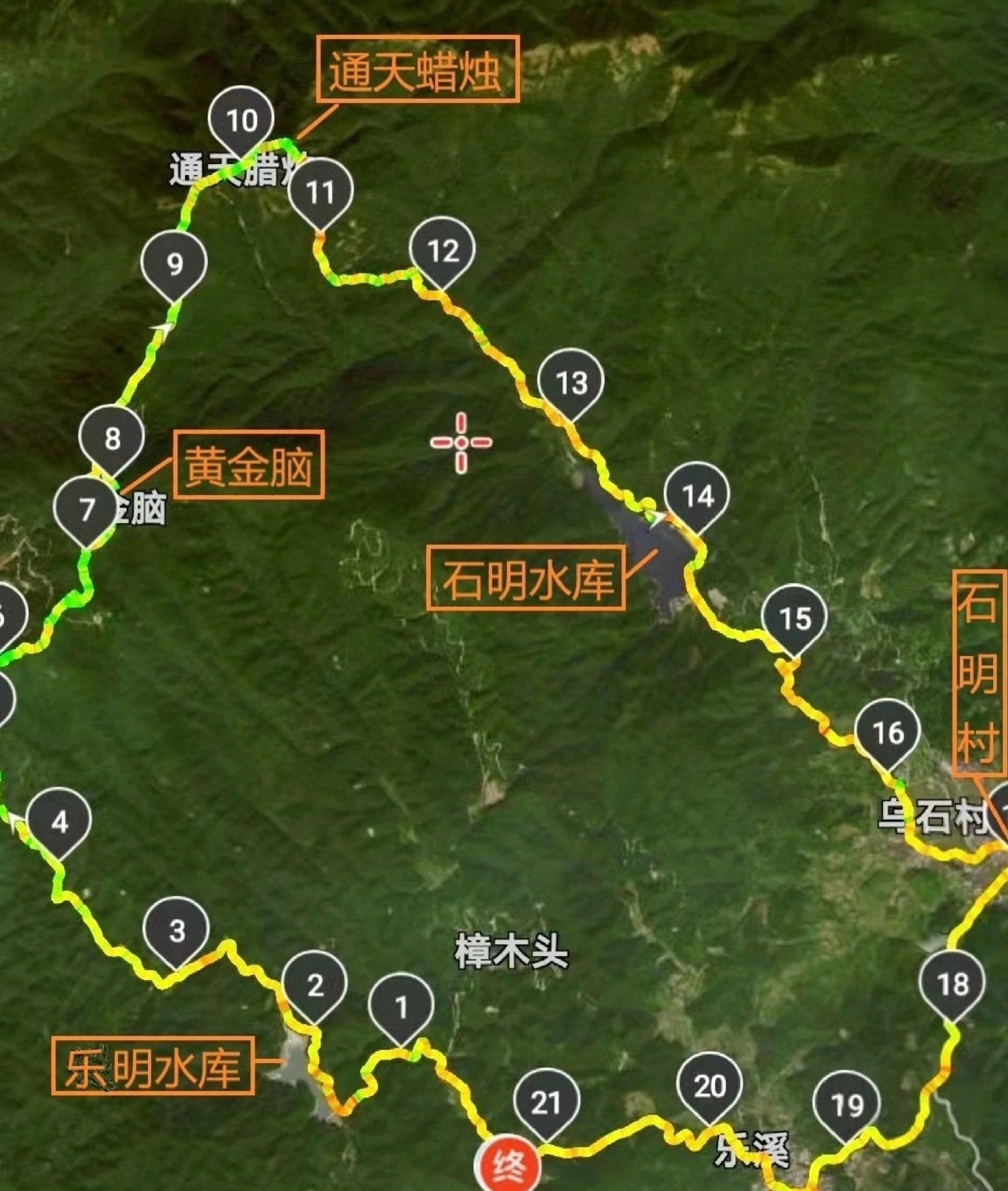 后半段为较陡泥路及碎石路,石明村-铜锣湾水库-急升坡-通天蜡烛-石明村(环线)