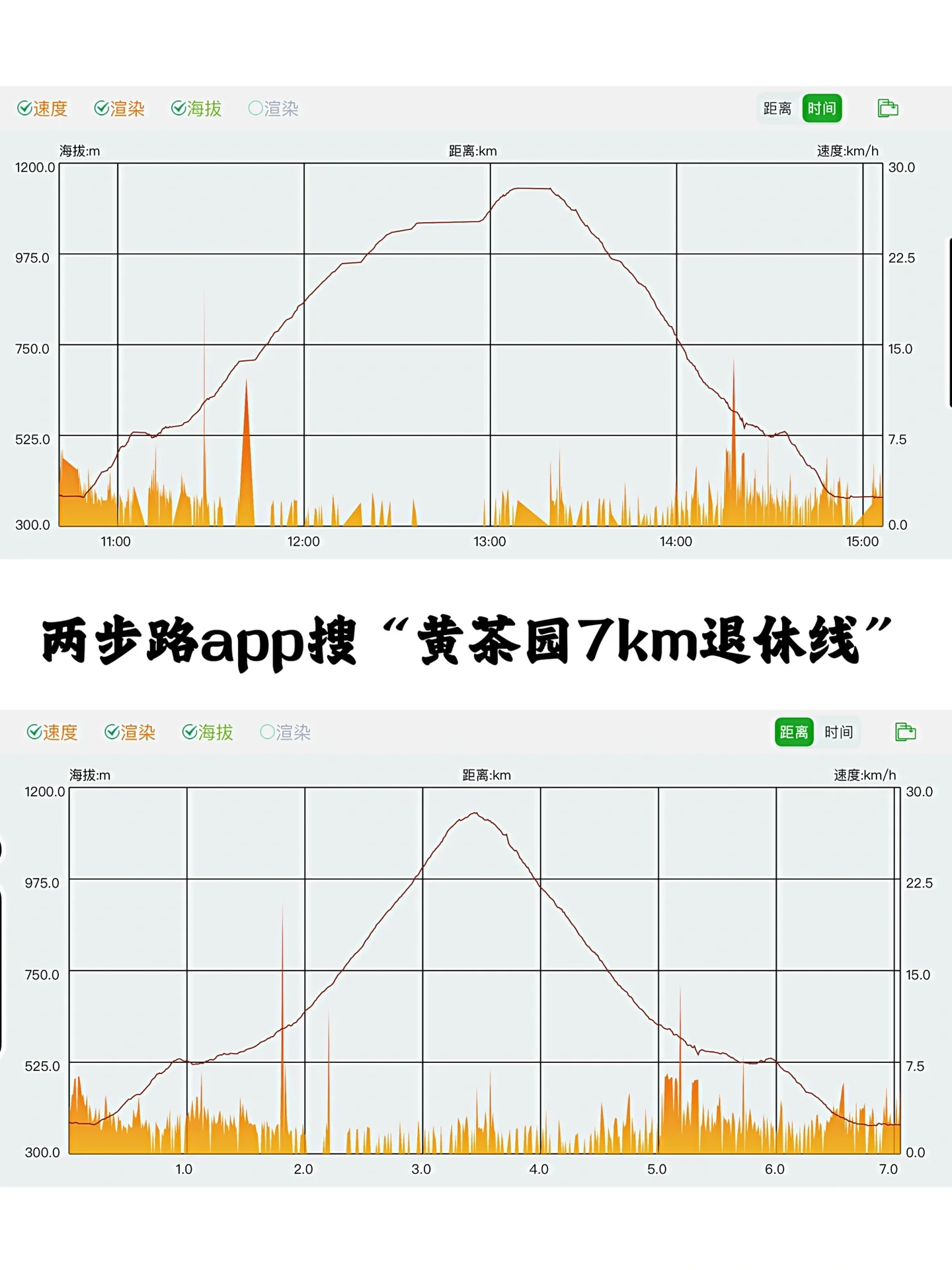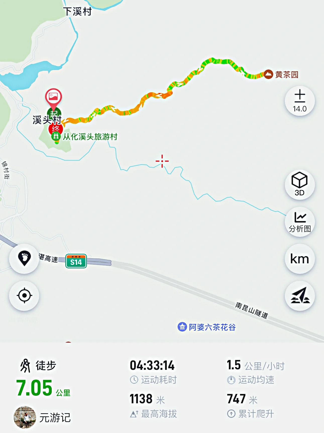 🚸1、7km环线适合全家出行,上山3.5km下山3.5km,坡度和爬升高度轻松(附图),一路缓升,直到登顶前穿越竹林(道路狭窄,上山者注意避让下山人),登顶后原路返回,路线可在两步路搜“从化十登黄茶园7km退休线”
