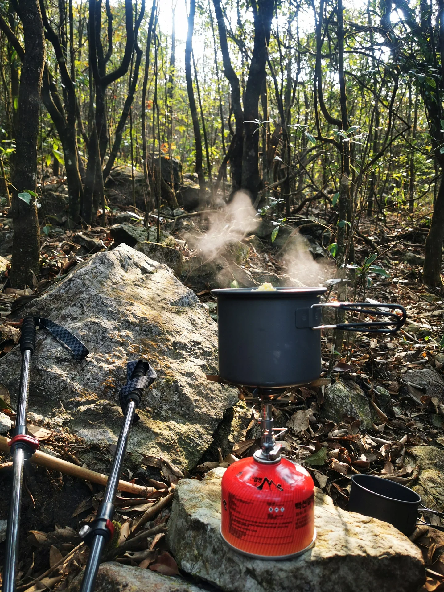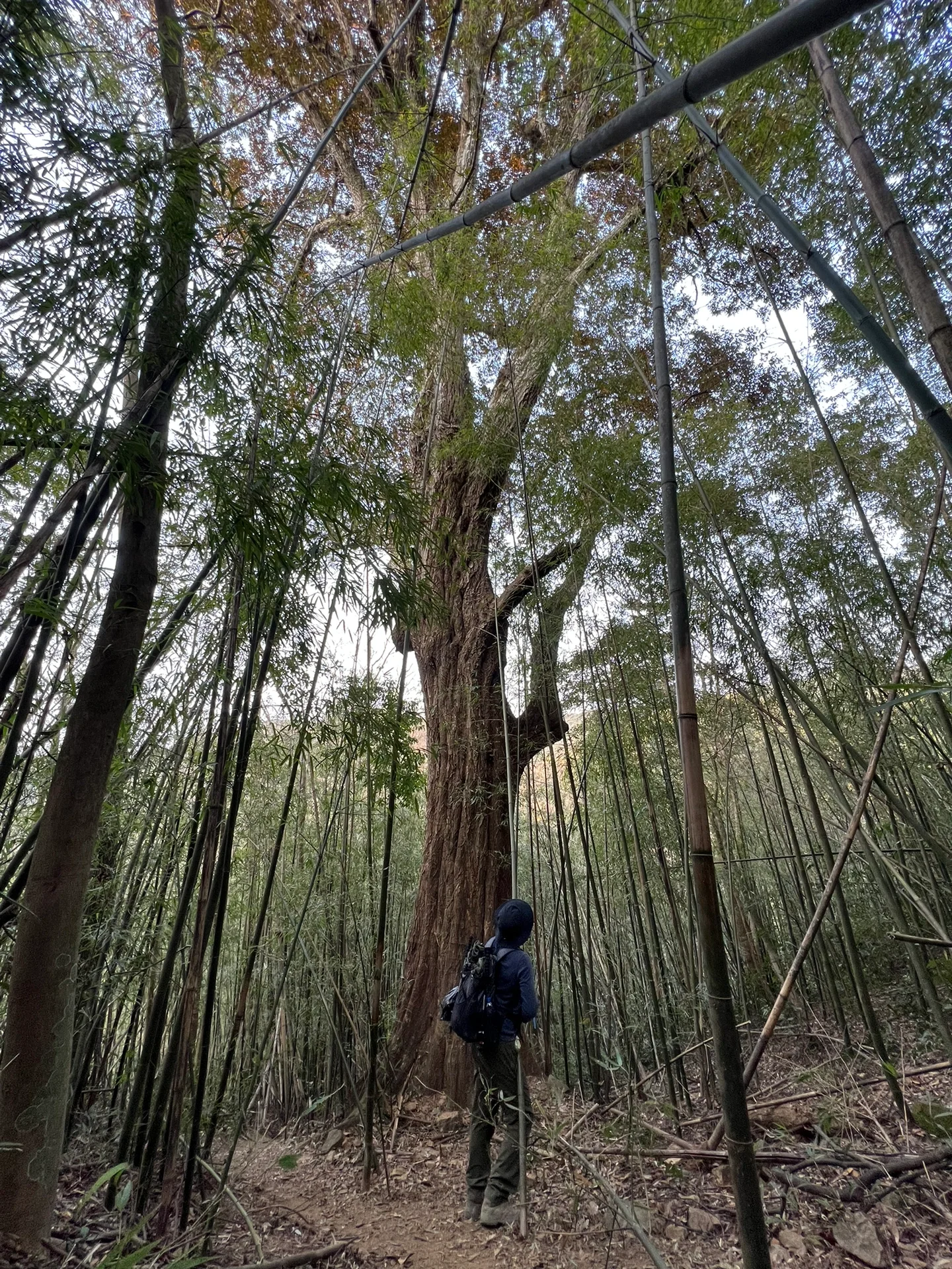 下山途中经过竹林路段比较陡峭,地面泥沙化,需要收起登山杖,双手攀竹进行速降。如带有长绳则可以利用绳索辅助。
