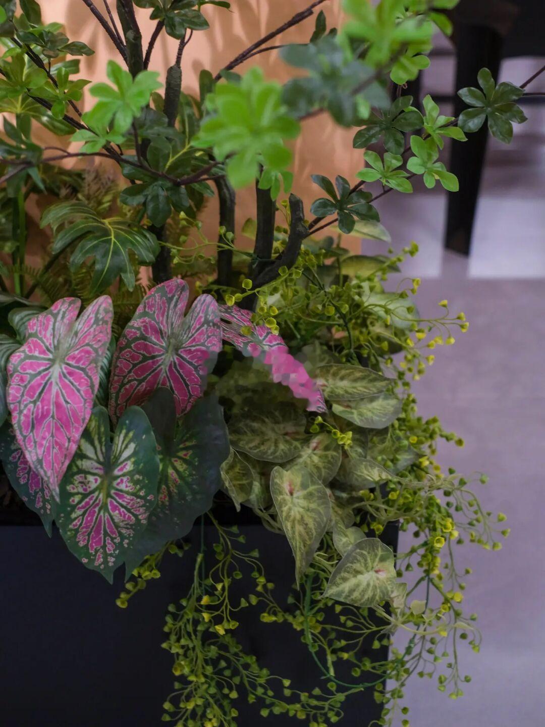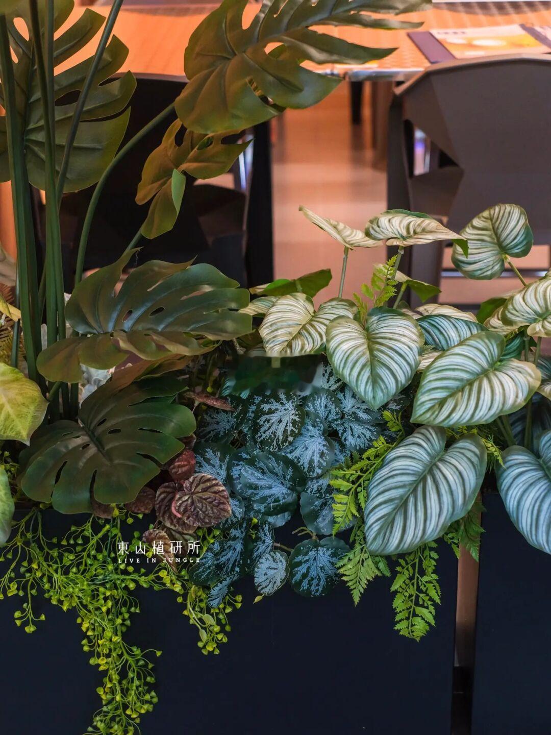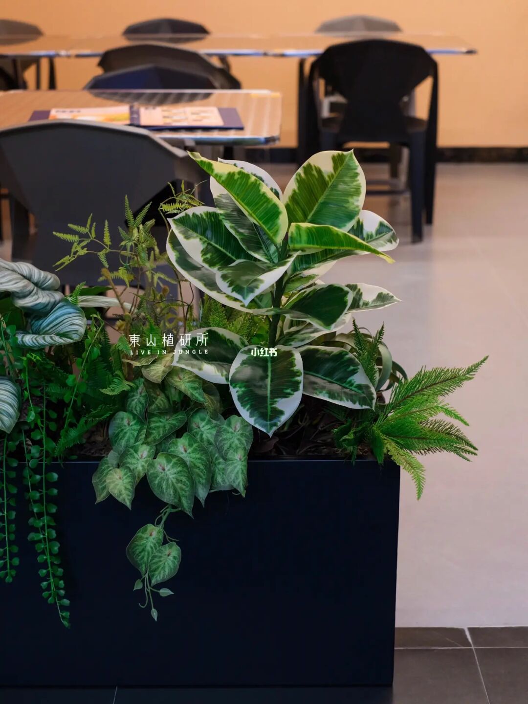 彩叶芋和花叶印度榕等纹理丰富、色彩斑斓的植物,