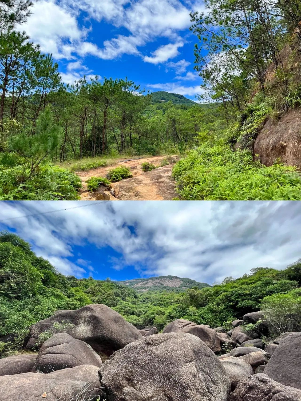 从大猪兜水库出来后,开始攀登山顶。要注意防滑和保持体力。山上有很多奇峰异石和小瀑布,风景不错。