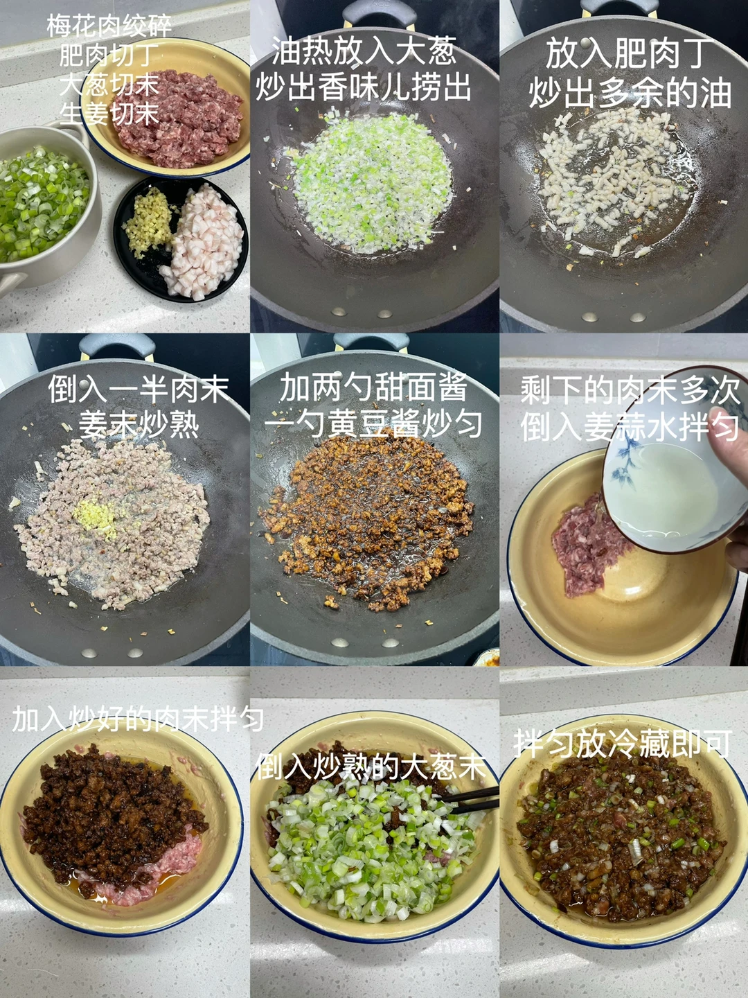 1⃣️:梅花肉绞成粗一点的颗粒,五花肉肥肉切成丁,大葱切丁,生姜切末,锅中油热倒入大葱末炒出葱油捞出,倒入一半肉末和姜末炒熟,加两勺甜面酱 一勺黄豆酱 少许老抽炒匀,剩下的梅花肉加入葱姜水搅匀,加少许盐增加底味儿,倒入炒好的肉末和大葱拌匀,放入冰箱冷藏