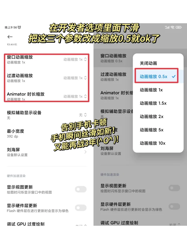 🌟离谱!想不到用了几年的老手机也能变得丝滑如新. 🌈这个方法尊嘟很简单,且立竿见影的明显能感觉到手机变流畅了很多~大家快学起来! 1⃣设置—我的设备—全部参数—连续点击MIUI版本号直到出现开发者模式—返回设置—更多设置—进入开发者选项. 2⃣把动画缩放全部改为0.5就ok了.告别手机卡顿,旧手机瞬间丝滑如新!