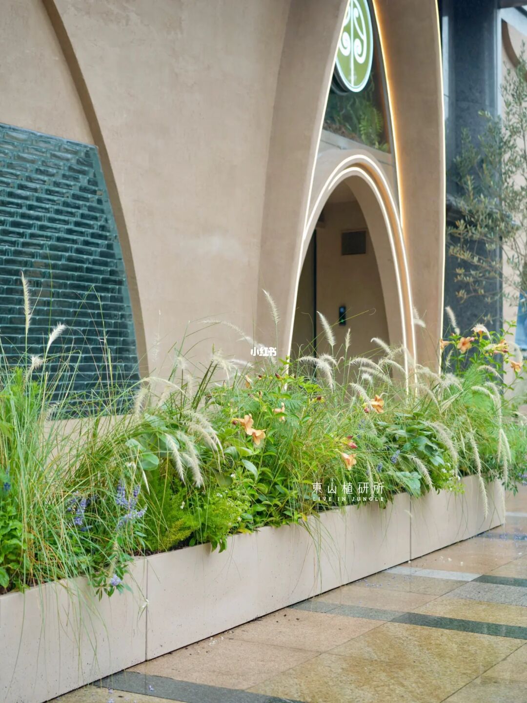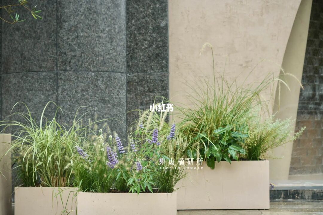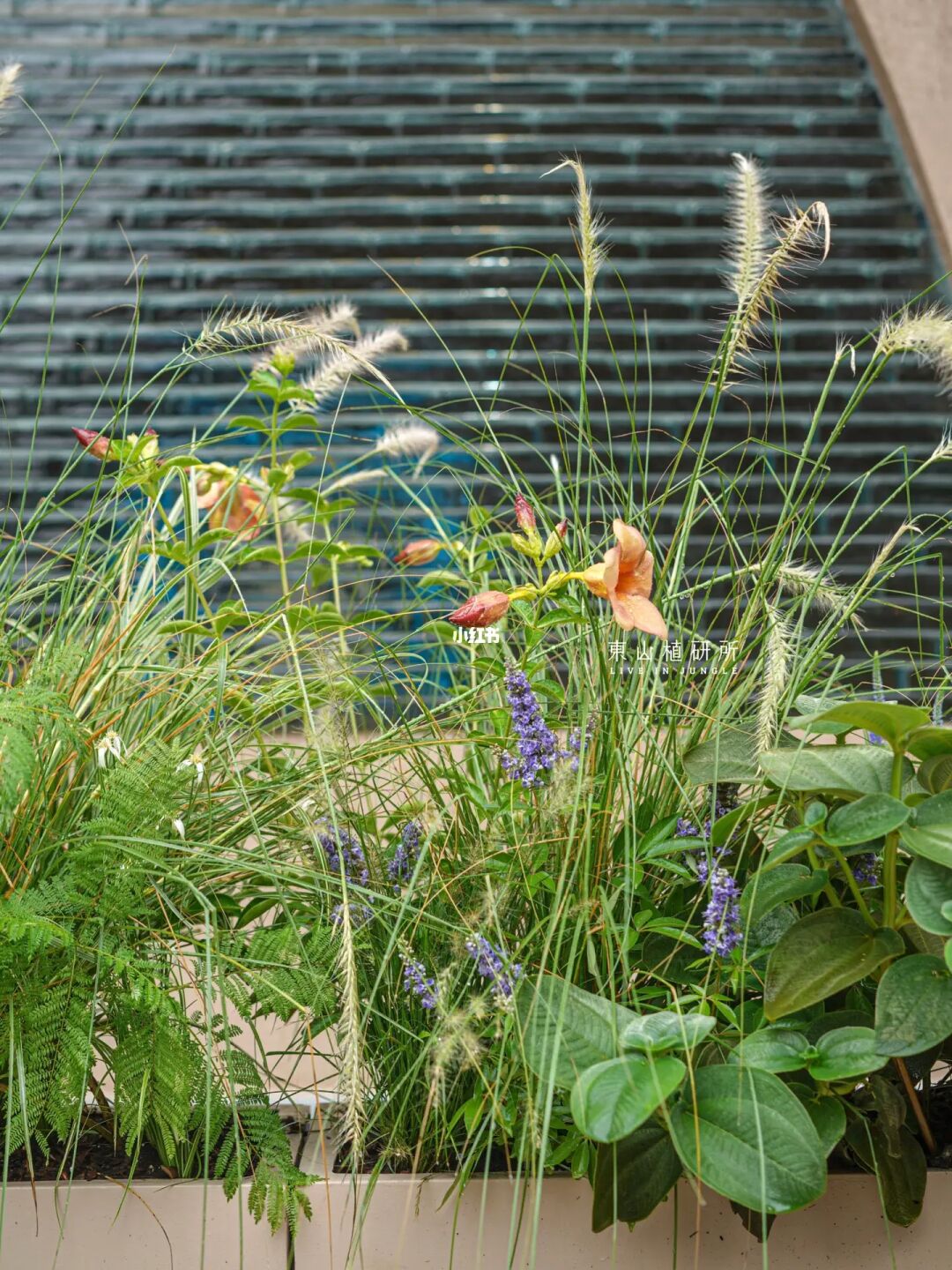 花叶蒲苇和银叶苍翘的自然,狼尾草绒毛般的质感为整个花箱增添了流动的柔美感和自然野趣