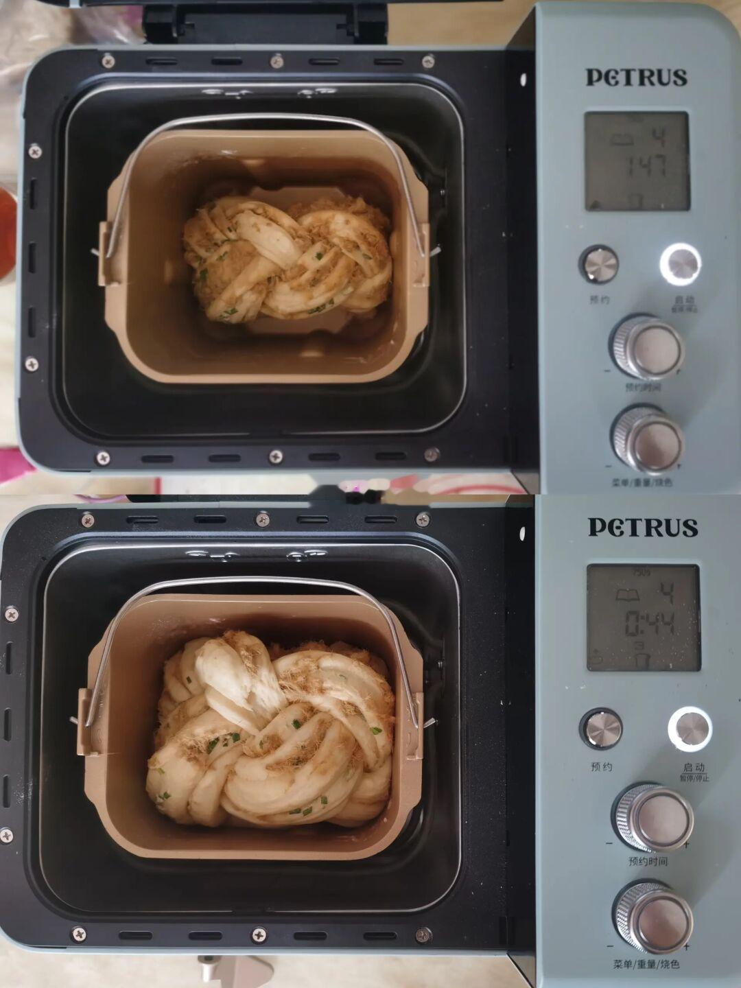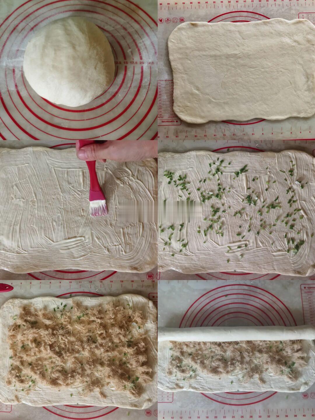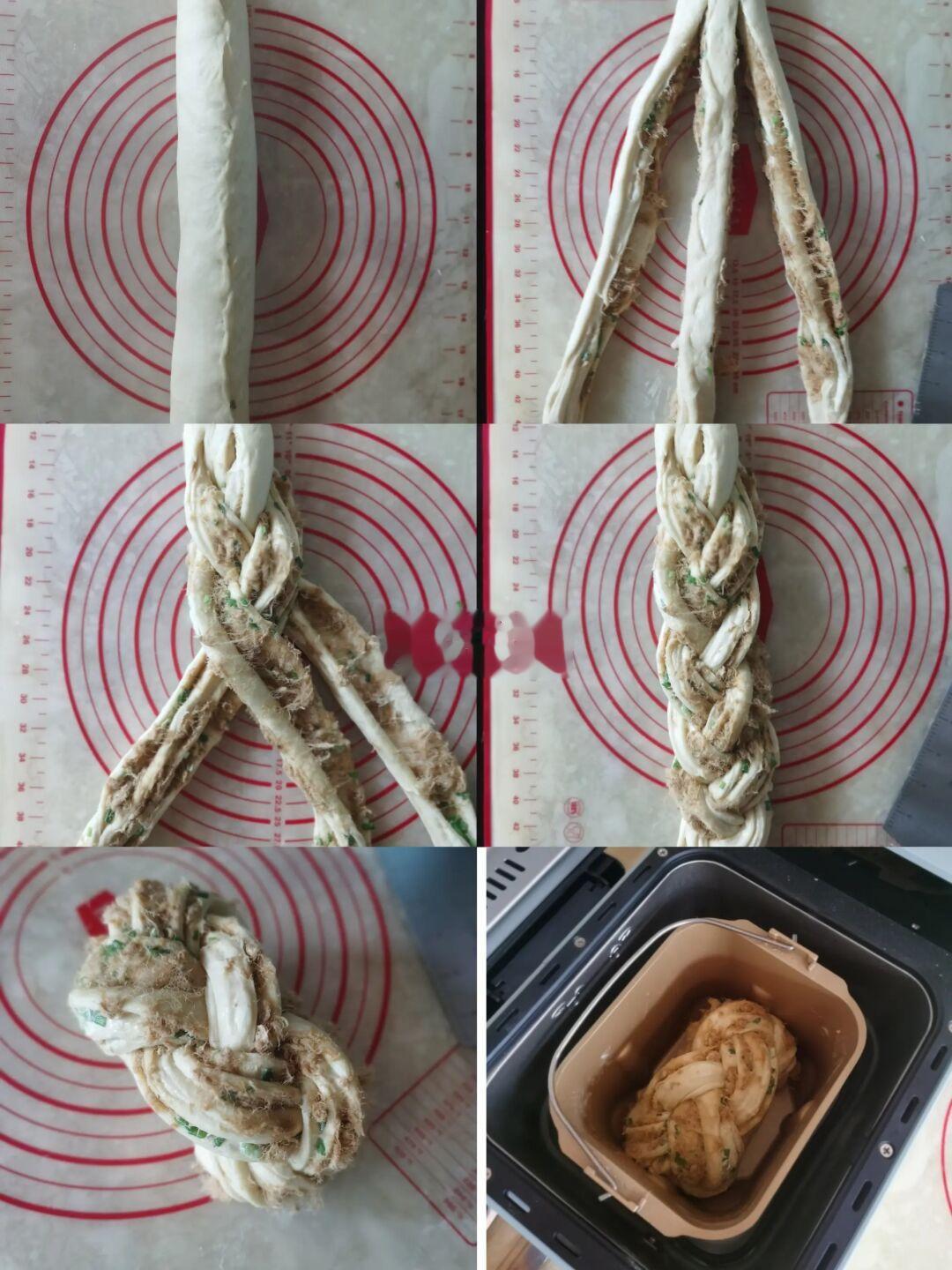 6. 开始整形:将面团擀面成25厘米宽,35里面长的面片,将沙拉酱均匀涂抹在表面,均匀撒满香葱和肉松,沿着长边慢慢卷起,卷到底后,捏紧收口。切成三条,交叉编辫子,将辫子面团首尾相连,整理好放回面包桶。放下盖子。