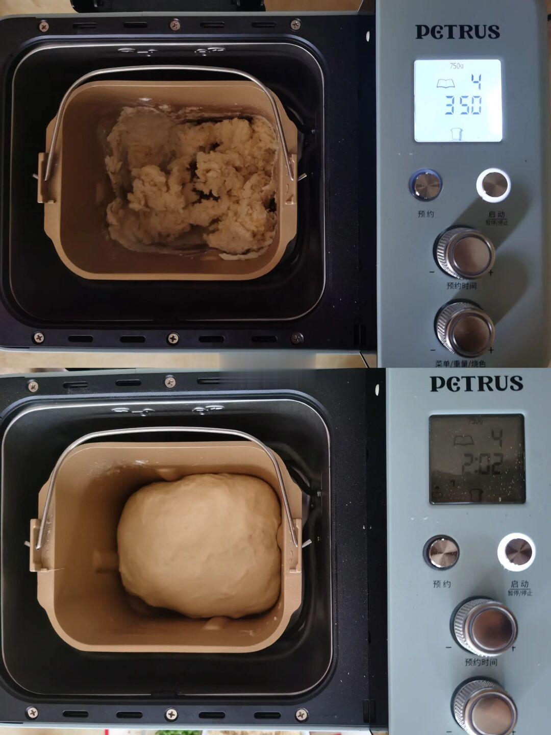 4. 当面包机工作到离完成还有2小时的时候,将面团取出,面包机盖子放下,维持面包机原温度(最好自己设个闹钟提醒)。这时候,面团已经完成了醒面、揉面和差不多半小时的发酵。柏翠面包机可以选择暂停键,特别适合用来整形,如果面包机没有暂停的,也没关系,可以牺牲一些发酵时间用来整形。