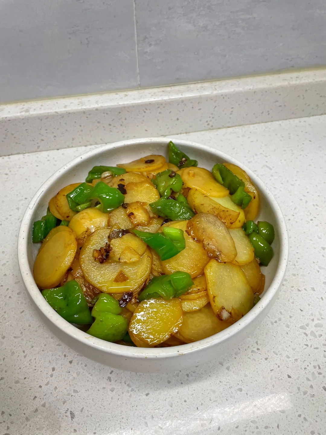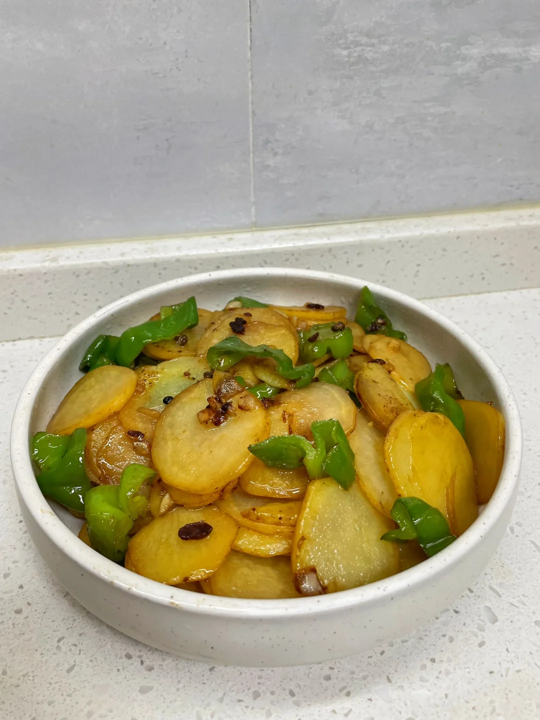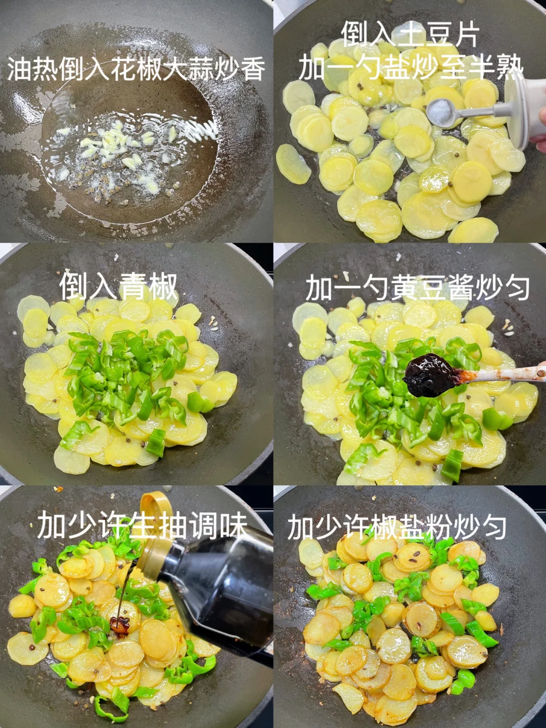 土豆片这样做,超级简单,几分钟就可以出锅的一道下饭菜~ 食材:土豆 青椒 配料:大蒜 花椒 盐 黄豆酱 椒盐粉 生抽 1⃣️:土豆去皮切片,青椒切小块备用 2⃣️:锅中稍微多一点后,放入大蒜和花椒炒香,再倒入土豆片,加一勺盐炒至半熟发软,再倒入青椒炒匀,加一勺黄豆酱炒匀,加少许生抽调味,土豆炒熟后加适量椒盐粉炒匀即可