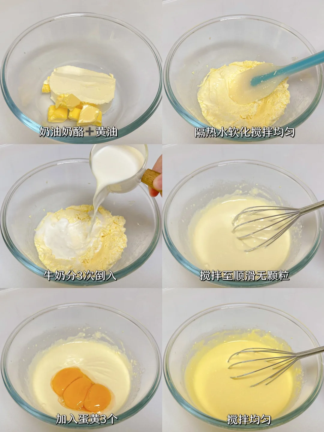 1⃣️奶油奶酪加黄油隔热水软化搅拌均匀,牛奶分3次加入并搅拌至顺滑无颗粒,加入蛋黄3个搅拌均匀,筛入低筋面粉和玉米淀粉搅拌均匀,将蛋黄糊过筛一遍备用。