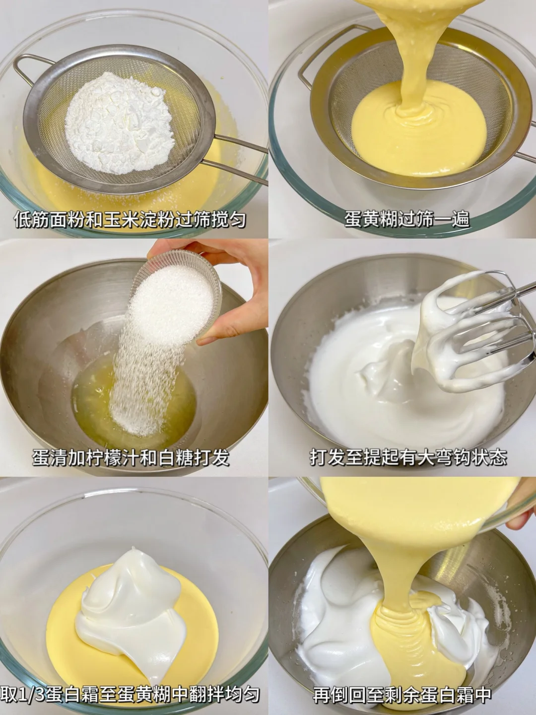 2⃣️蛋清中加入柠檬汁和白糖打发至提起有大弯钩状态,取1/3蛋白霜至蛋黄糊中翻拌均匀,再倒回至剩余蛋白霜中翻拌均匀,倒入铺有油纸的6寸蛋糕模具中。