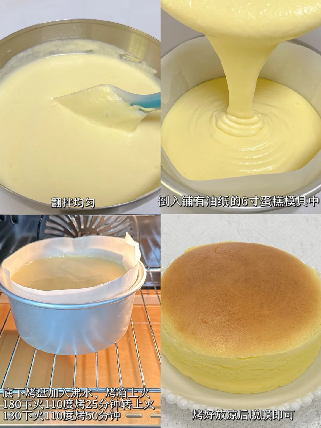 3⃣️烤箱提前预热,底下烤盘中加入沸水,烤箱上火180下火110度烤25分钟转上火130下火110烤50分钟,烤好放凉后脱模即可开吃,也可冷藏后吃。