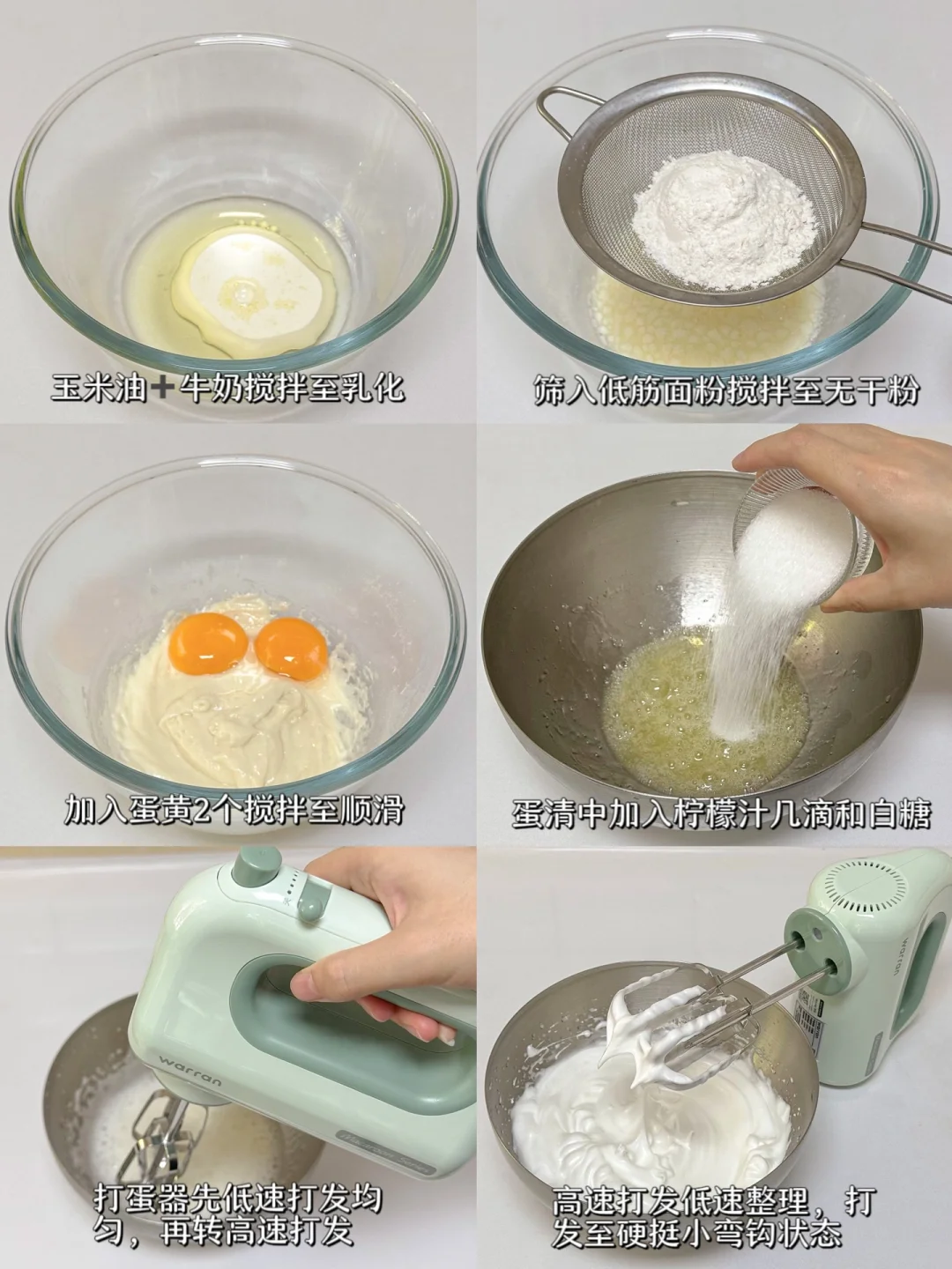 1⃣️玉米油+牛奶搅拌至乳化,筛入低筋面粉搅拌至无干粉,加入蛋黄2个搅拌至顺滑。
