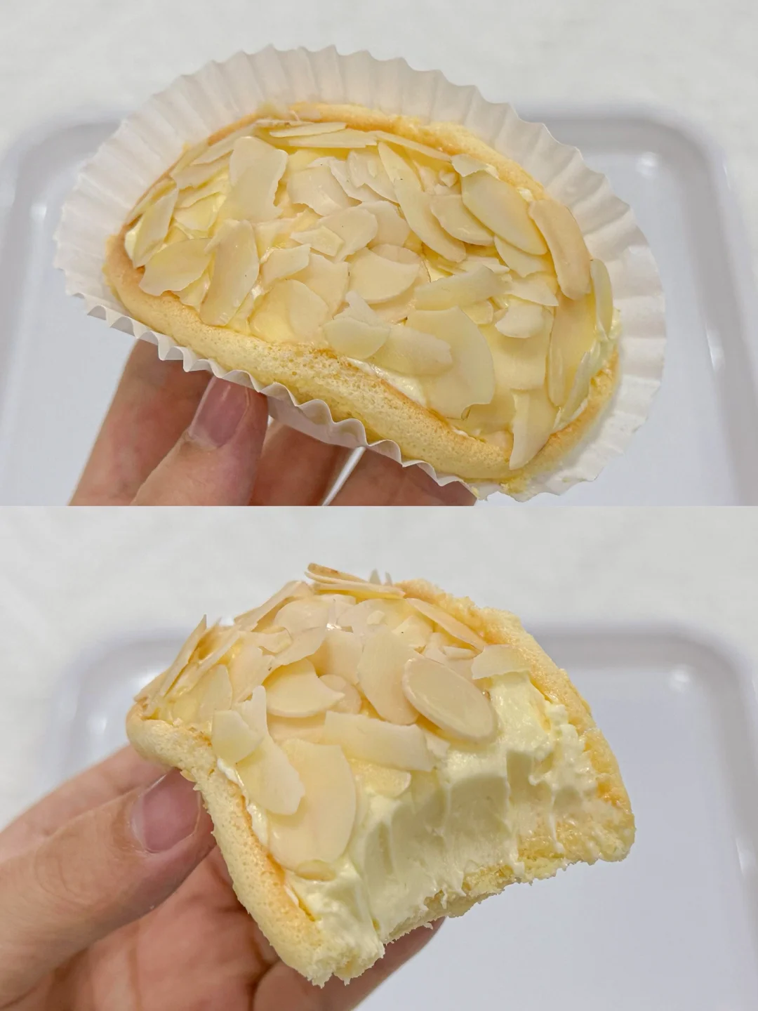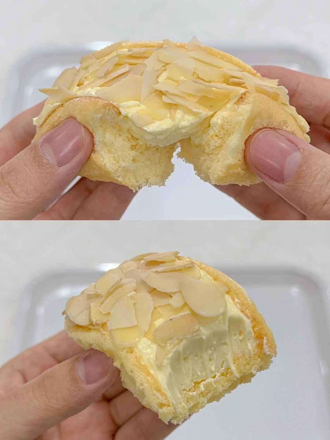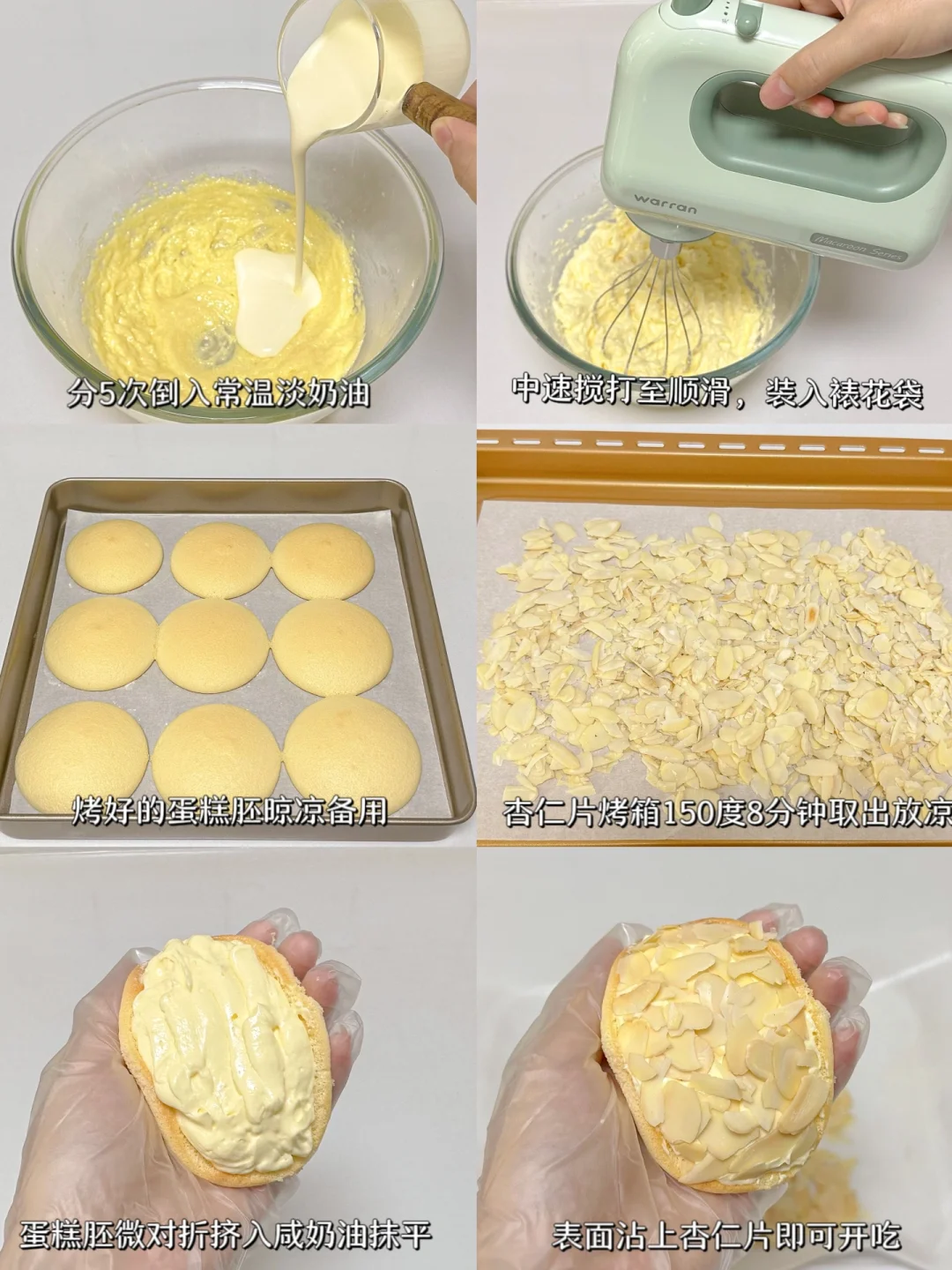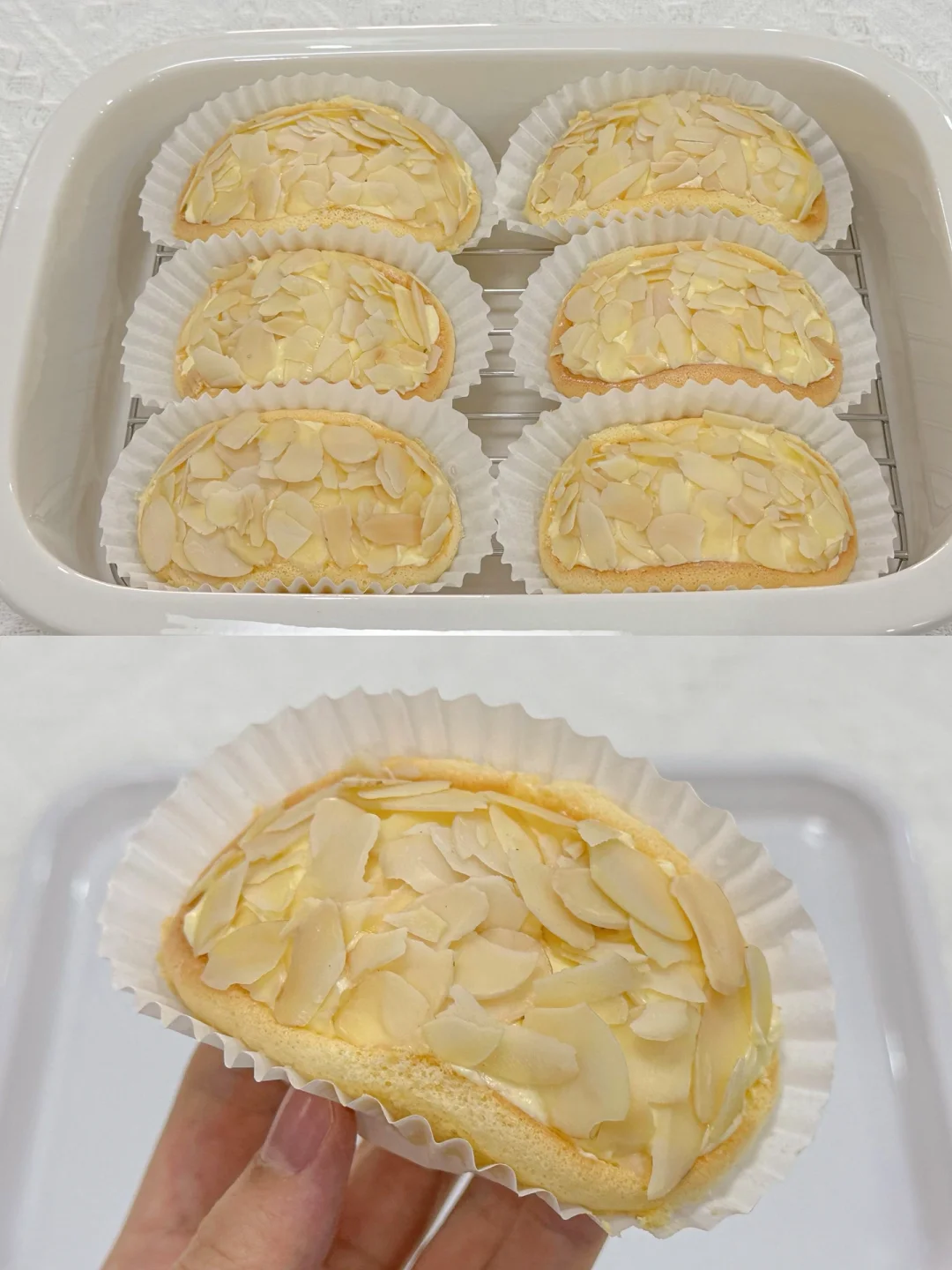 4⃣️烤好的蛋糕胚晾晾备用;杏仁片烤箱150度烘烤8分钟取出放凉,蛋糕胚微对折挤入咸奶油并抹平,表面沾上杏仁片即可开吃。