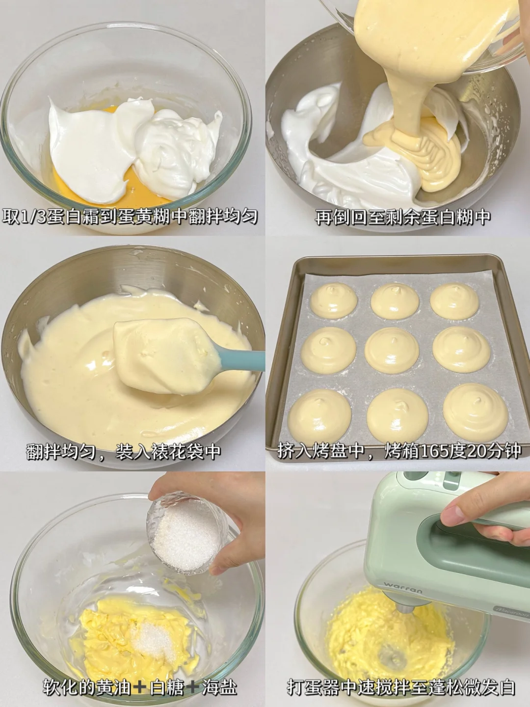 2⃣️蛋清中加入柠檬汁和白糖,打蛋器先低速混合均匀,再转高速打发,最后转低速整理,打发至硬挺小弯钩状态,取1/3蛋白霜到蛋黄糊中翻拌均匀,再倒回至剩余蛋白糊中拌匀,装入裱花袋,挤入烤盘中,烤箱提前预热,烤箱165度20分钟。