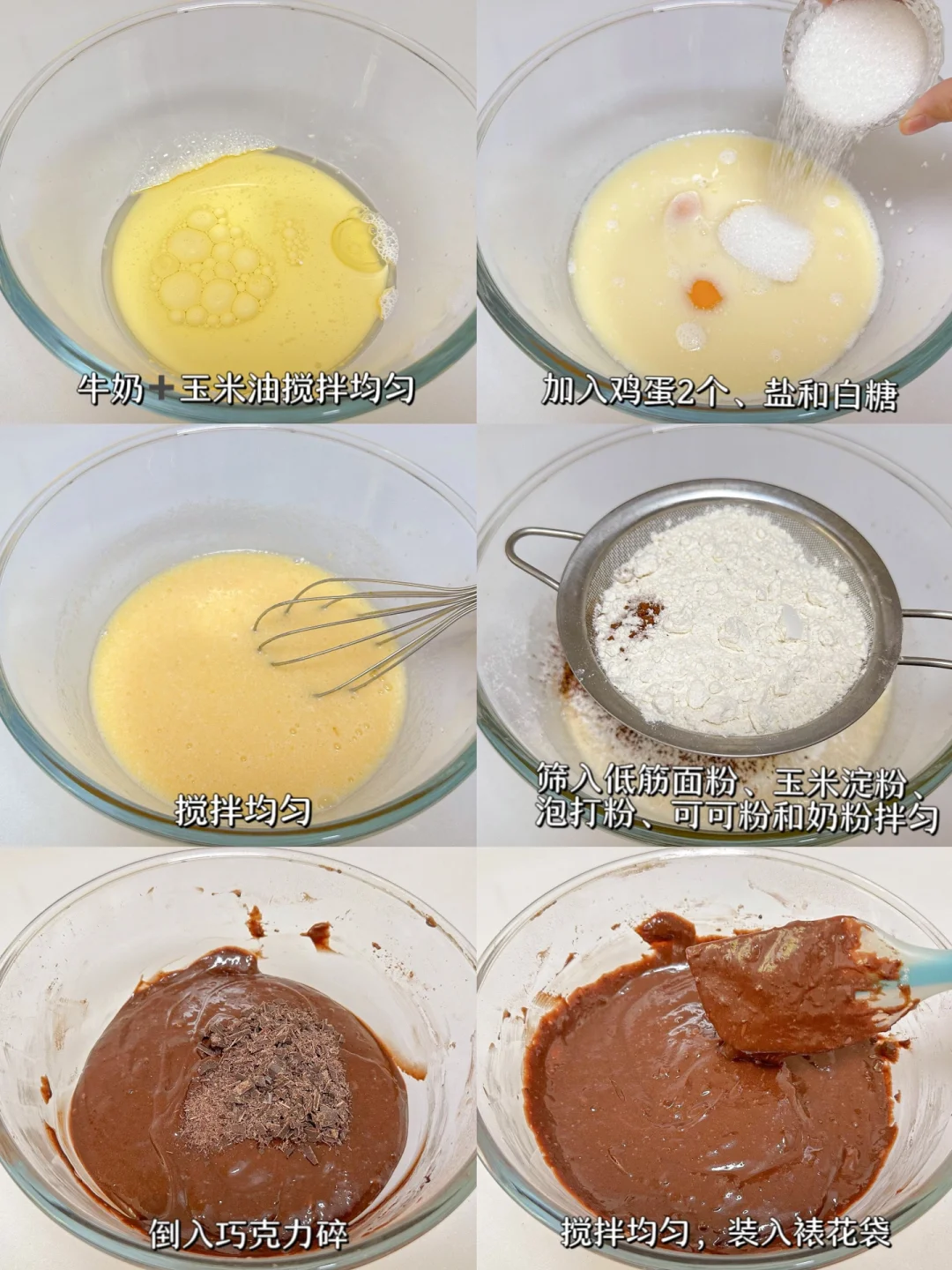 1⃣️牛奶+玉米油搅拌均匀,加入鸡蛋2个、食盐和白糖搅拌均匀,筛入低筋面粉、玉米淀粉、泡打粉、可可粉和奶粉拌匀,倒入巧克力碎搅拌均匀,装入裱花袋。