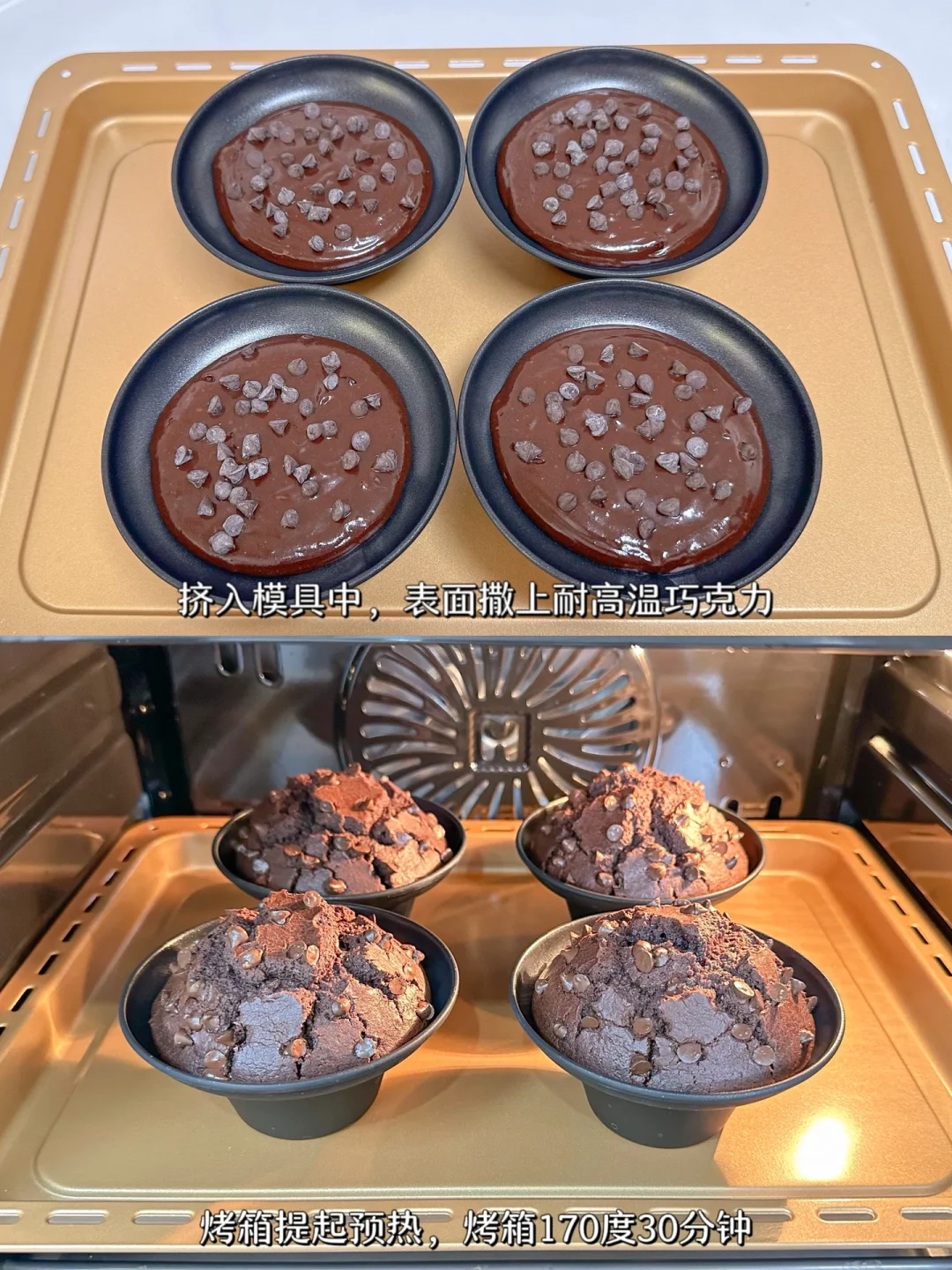 2⃣️将麦芬糊挤入模具中,表面撒上耐高温巧克力,烤箱提前预热,烤箱170度30分钟即可。