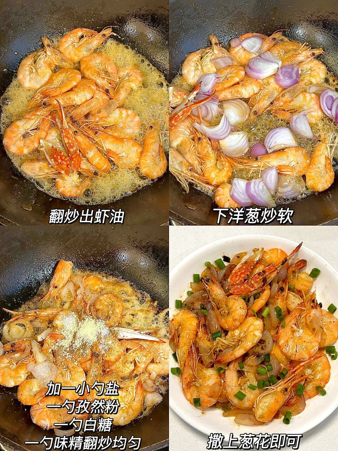 香迷糊了的干锅虾🦐!真的巨好吃!!外酥里嫩的!好吃到我连壳都直接吞了~[赞R][赞R][赞R] ㅤ 🌟准备食材🌟 虾 洋葱 葱 🌟做法🌟 1️⃣虾去虾线,洋葱切丝,锅中加油加葱白炒香,加入大虾翻炒出虾油 2️⃣下洋葱炒软,加入一小勺盐➕一勺孜然粉➕1勺白糖➕一勺味精翻炒均匀,撒上葱花即可 ㅤ 这个做法炒螃蟹也是可以的哦~买菜的时候阿姨还送了我个蟹脚,放一起炒了也好好吃!![喝奶茶R][喝奶茶R][喝奶茶R]