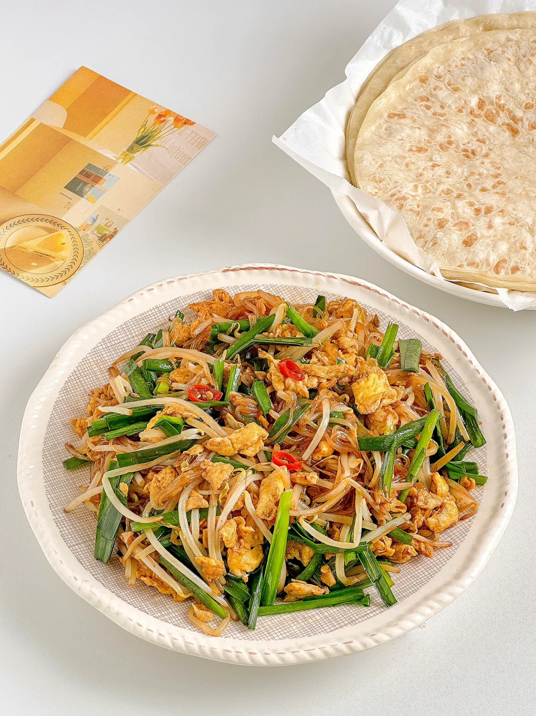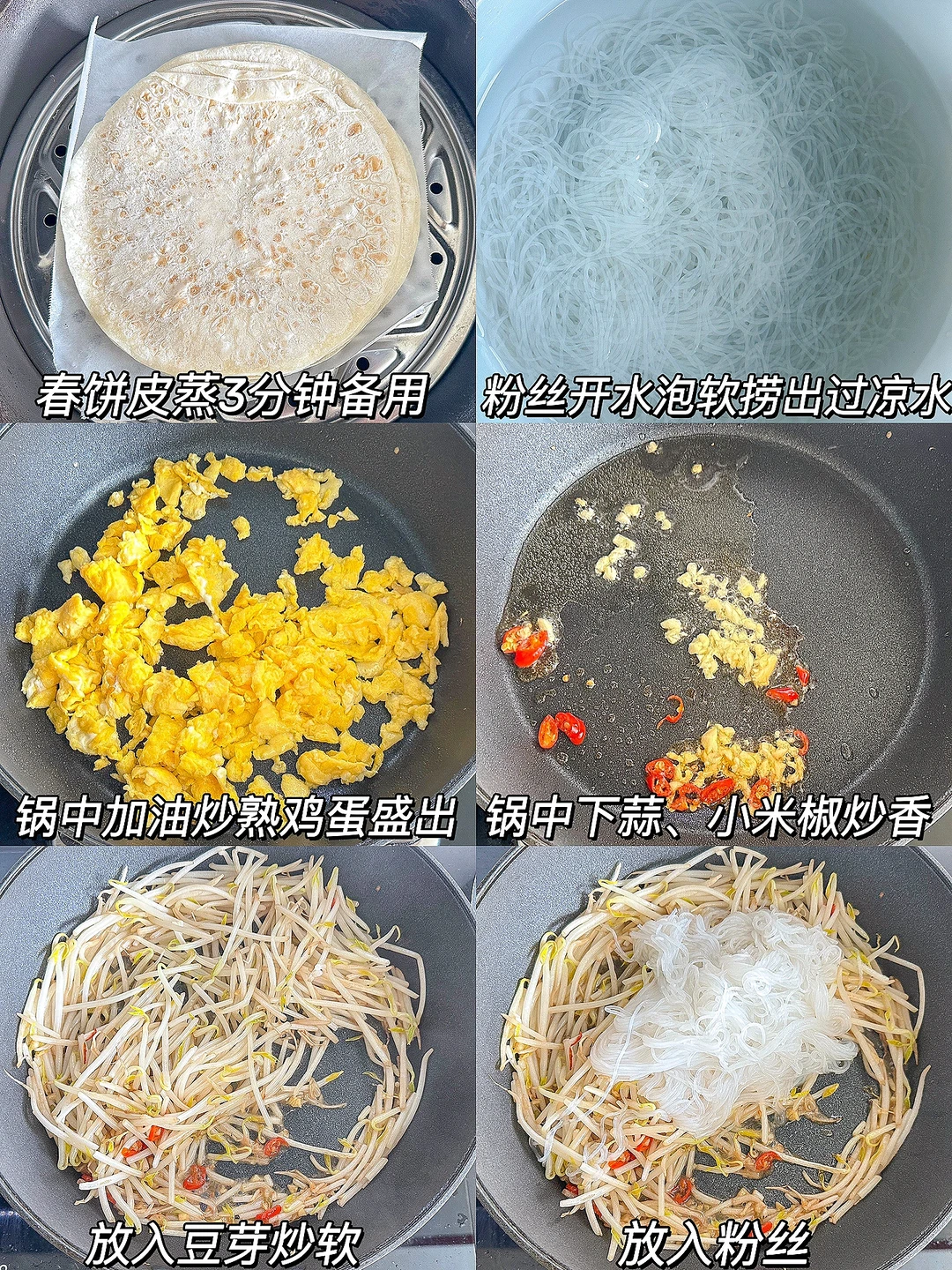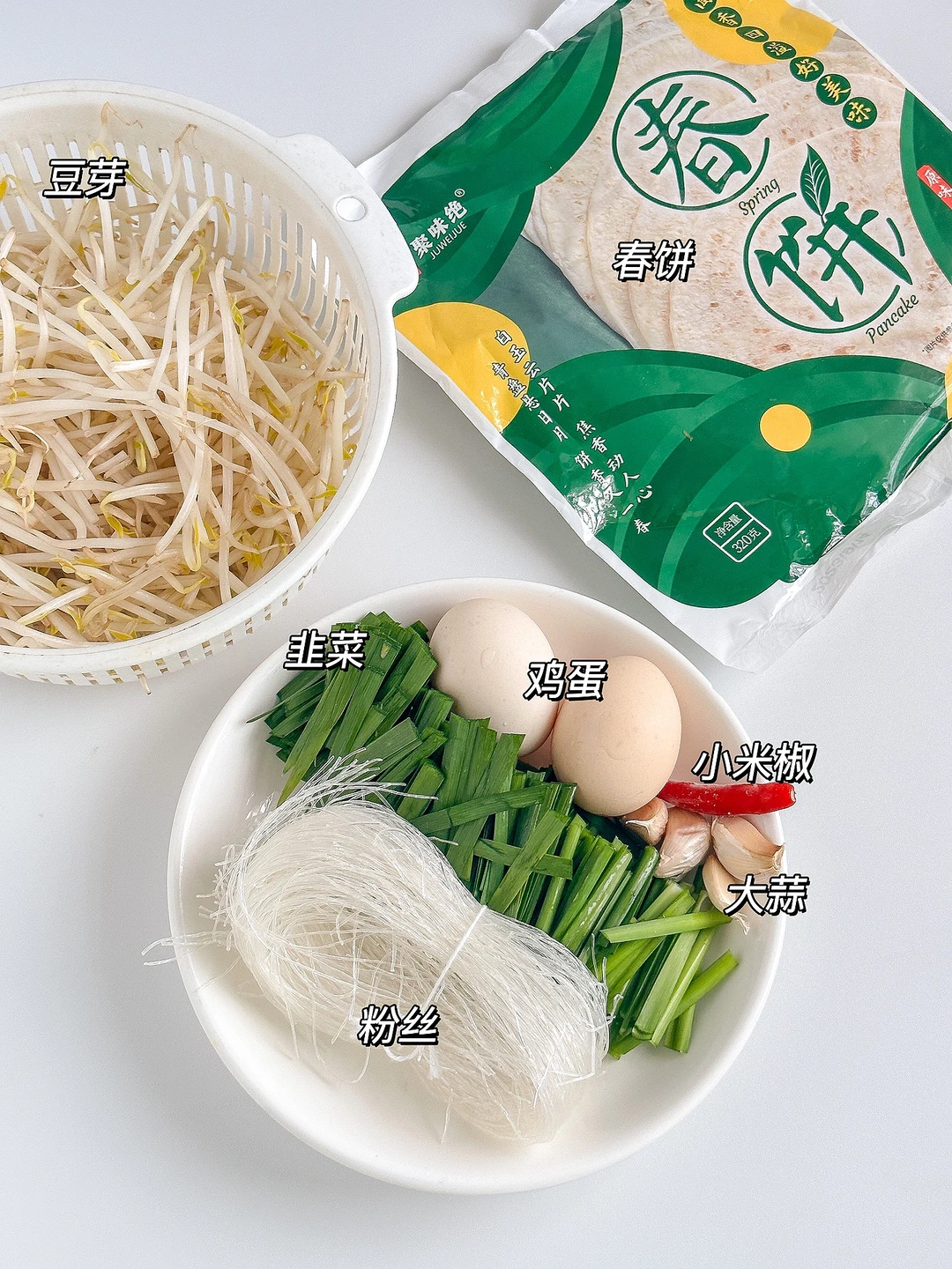 从小吃到大的炒合菜!不管是配饭还是卷饼都巨好吃!卷起来一口一口吃得好满足~😋 ㅤ 🌟准备食材🌟 绿豆芽 韭菜 粉丝1捆 鸡蛋2颗 大蒜 小米椒 春饼皮 🌟做法🌟 1️⃣春饼皮蒸3分钟备用 2️⃣粉丝开水泡软捞出过凉水,锅中加油炒熟鸡蛋盛出 3️⃣锅中下蒜、小米椒炒香,放入豆芽炒软,放入粉丝,➕2勺生抽➕1勺老抽➕少于盐味精翻炒均匀,加入韭菜和鸡蛋炒匀即可出锅 ㅤ 炒好的菜拿来卷饼就可以开吃啦!!春饼皮不仅可以包合菜,还可以包土豆丝、京酱肉丝都很好吃哦~🥰
