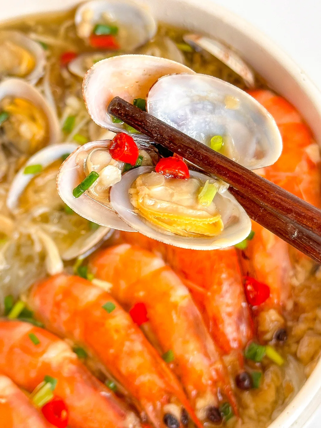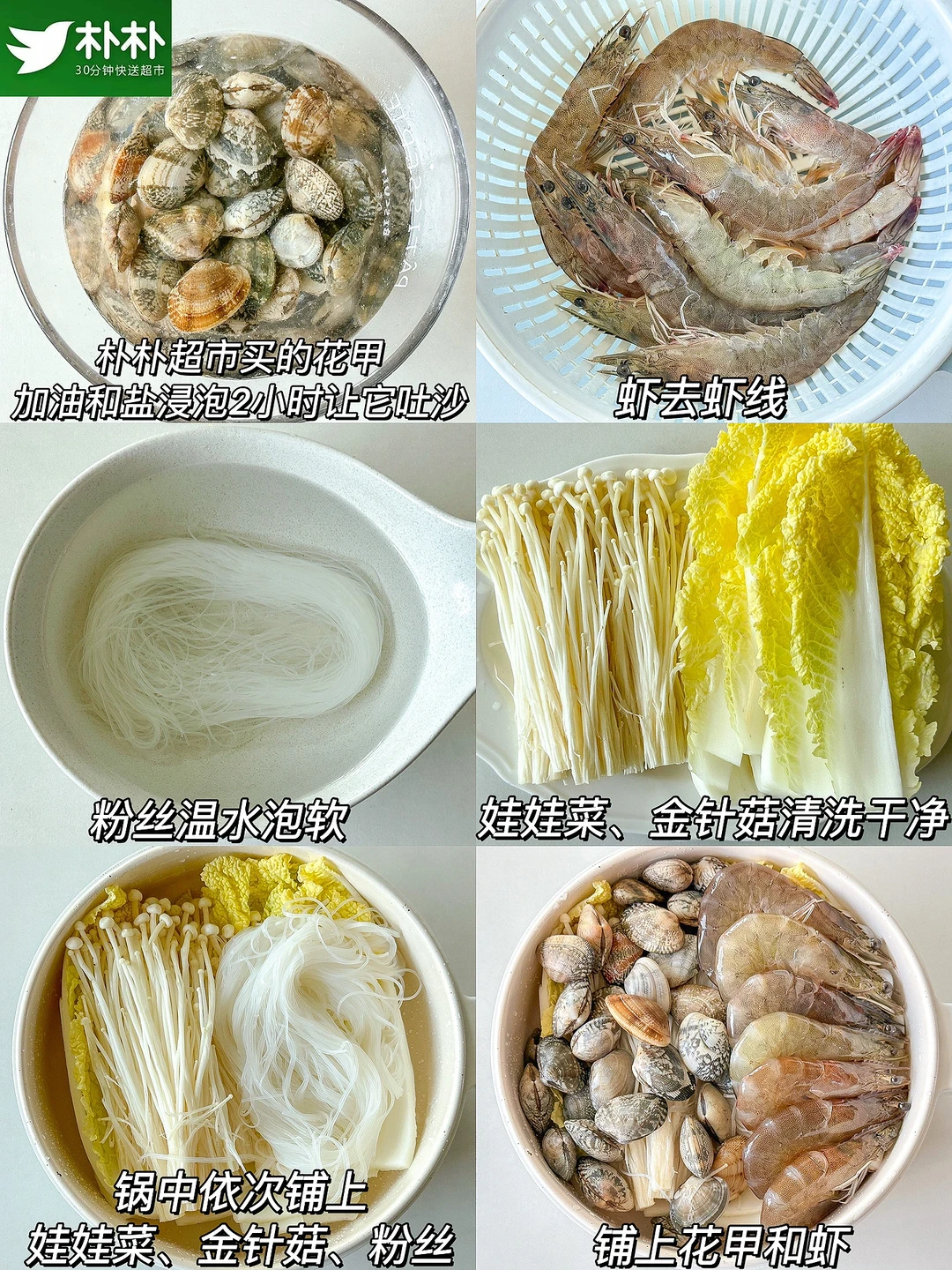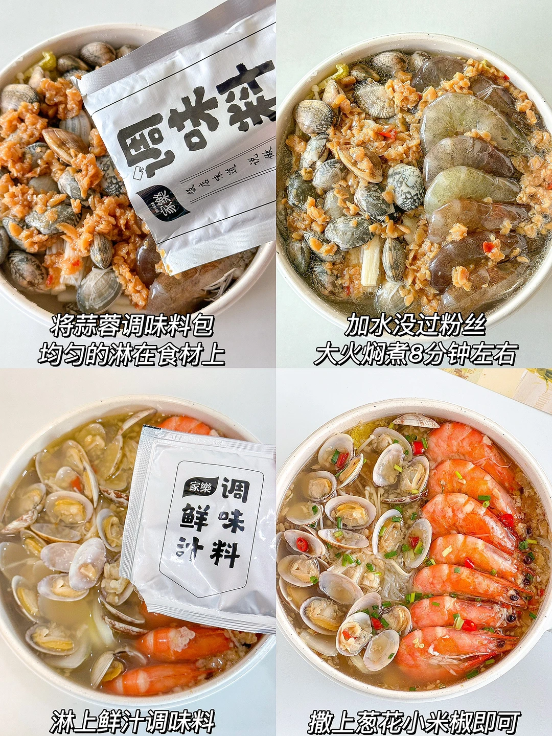 越吃越上瘾的蒜蓉花甲粉丝煲!香辣过瘾,一口一口鲜到掉毛!完爆夜市摊!做法简单又快手~厨房小白也可以轻松驾驭哦😋😋😋 ㅤ 🌟准备食材🌟 花蛤半斤 虾 娃娃菜 金针菇 家乐金银蒜蓉粉丝海鲜调味料 小米椒 葱 🌟做法🌟 1️⃣花甲加油和盐浸泡2小时让它吐沙,虾去虾线,粉丝加温水泡软,娃娃菜、金针菇清洗干净 2️⃣锅中依次铺上娃娃菜、金针菇、粉丝、花甲和虾,将蒜蓉调味料包均匀的淋在食材上,加水没过粉丝,大火焖煮8分钟左右 3️⃣淋上鲜汁调味料,撒上葱花小米椒即可 ㅤ 简单又好吃的蒜蓉花甲粉丝煲就完成啦!有条件的也可以用砂锅哦~朴朴超市App的海鲜也好新鲜!!😋 ㅤ 家乐私厨酱调味料真的好方便,也是朴朴超市App就有,不用自己剥蒜捣蒜炒蒜蓉,一包搞定!方便又省事,做出来的味道比店里的都好吃👏👏👏 ㅤ