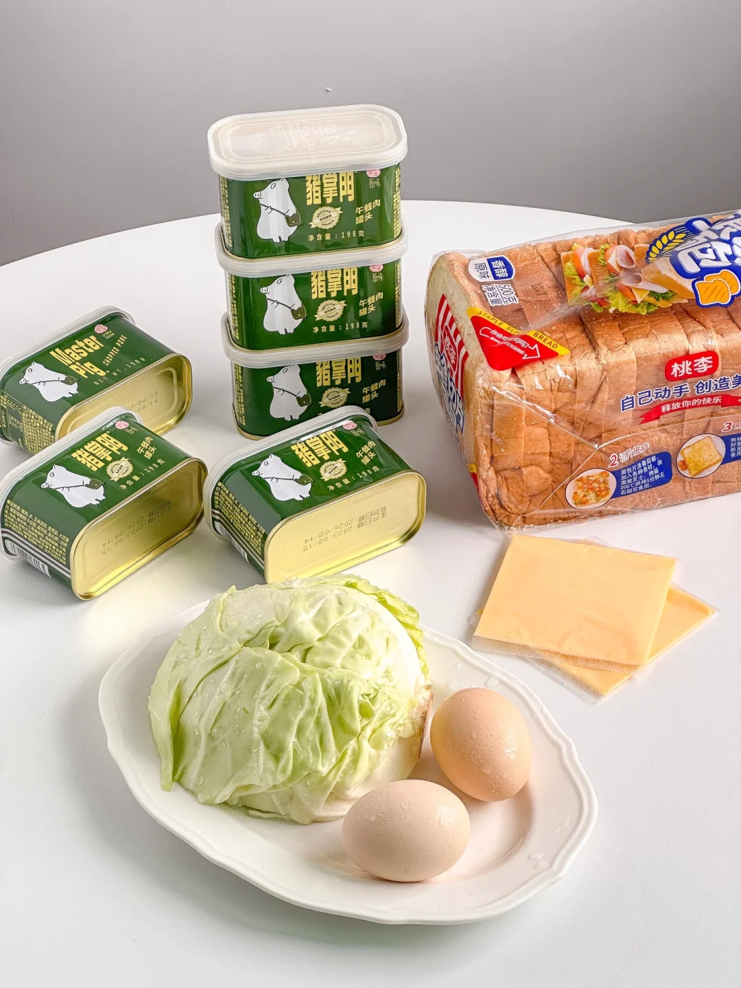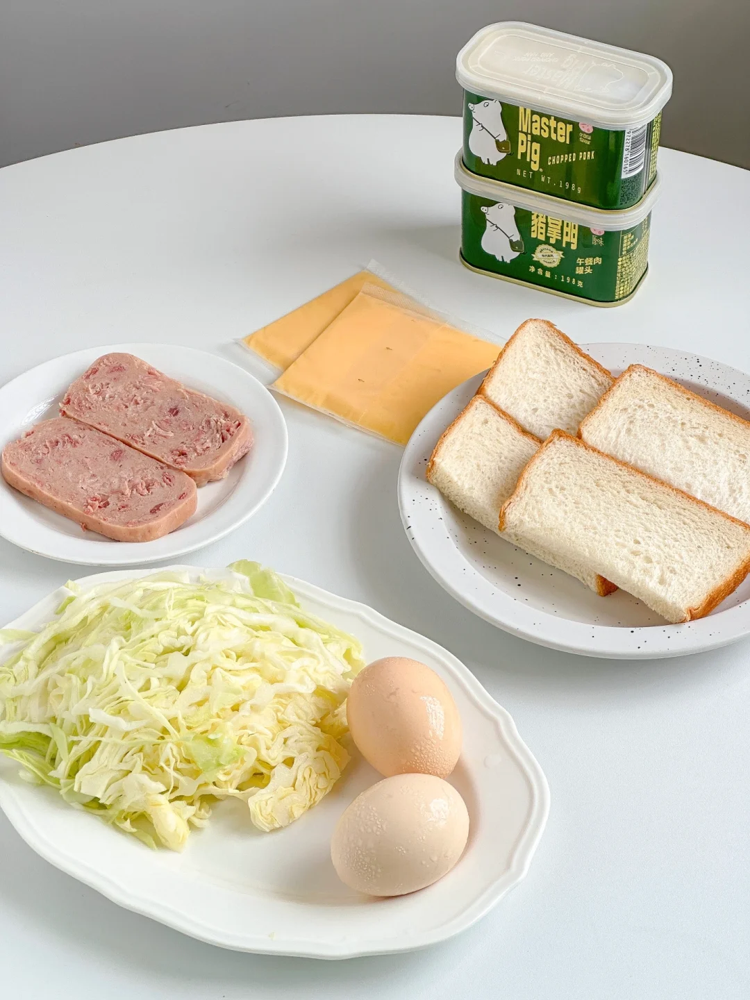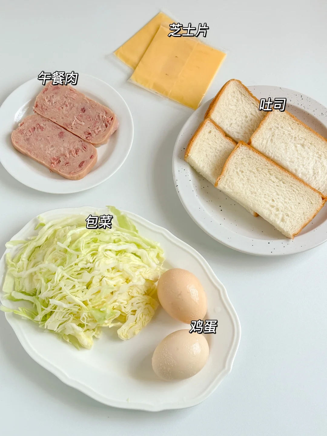 吐司两片 午餐肉两片 芝士两片 鸡蛋2颗 包菜