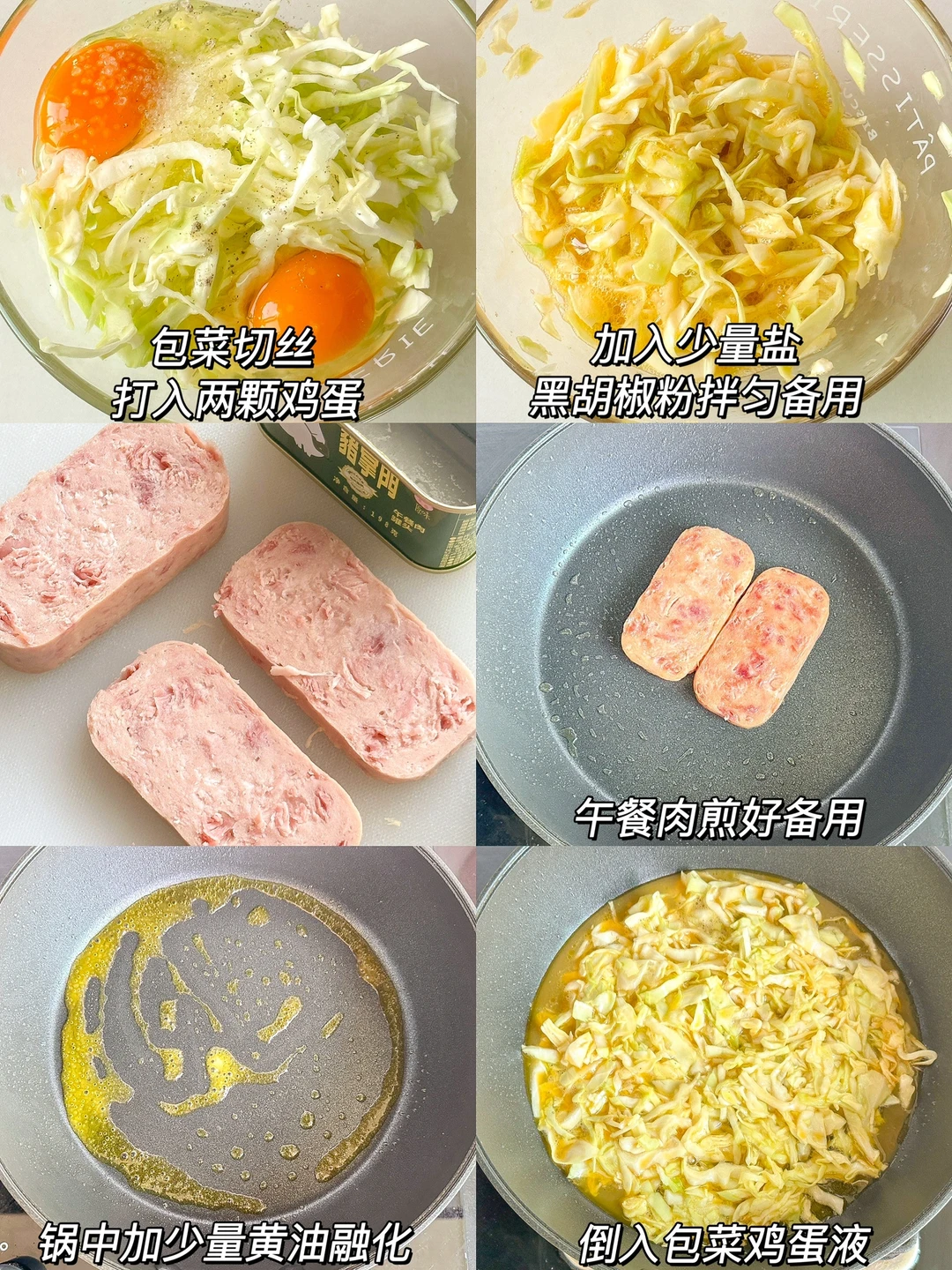 1️⃣包菜切丝,打入两颗鸡蛋,加入少量盐,黑胡椒粉拌匀备用,午餐肉煎好备用